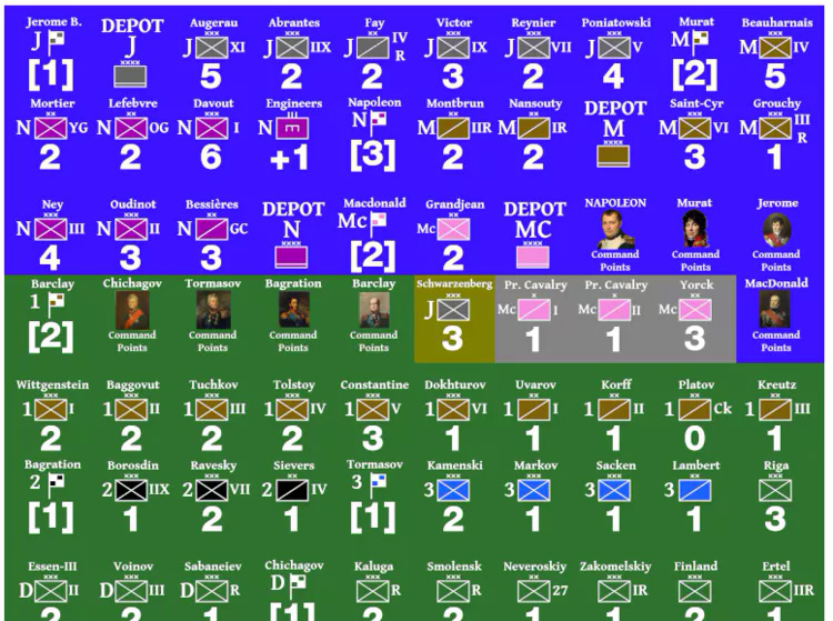 Les unités sont des corps d'infanterie et des divisions de cavalerie, qui appartiennent chacun à l'un des groupes d'armée de leur nation. Les groupes d'armées sont dirigés par des chefs qui génèrent des points de commandement à chaque tour, utilisés pour commander les unités sous leur commandement.