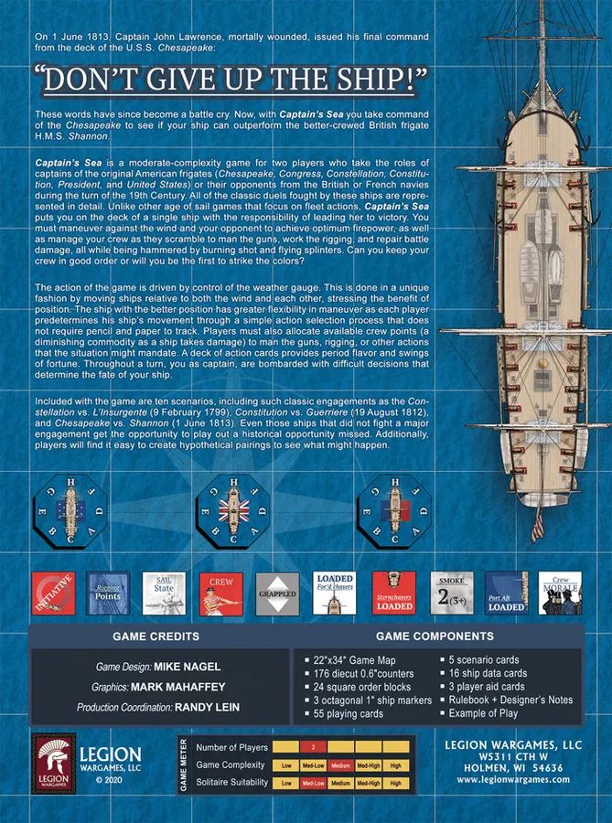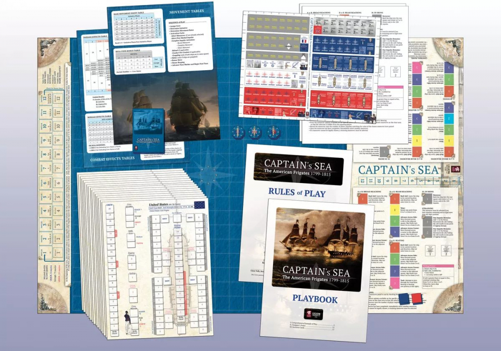 Captain's Sea est un jeu de complexité faible à modérée pour deux joueurs qui incarnent les capitaines des frégates américaines originales (Chesapeake, Congress, Constellation, Constitution, President et United States) ou leurs adversaires des marines britannique ou française au tournant du 19e siècle. Tous les duels classiques menés par ces navires sont représentés en détail. Contrairement aux autres jeux de l'ère de la voile qui se concentrent sur les actions de la flotte, Captain's Sea vous place sur le pont d'un seul navire avec la responsabilité de le mener à la victoire. Vous devez manœuvrer contre le vent et votre adversaire pour obtenir une puissance de feu optimale, ainsi que gérer votre équipage qui se démène pour armer les canons, travailler sur le gréement et réparer les dégâts de la bataille, tout en subissant les coups de feu et les éclats volants causés par votre ennemi. Pourrez-vous maintenir votre équipage en bon état ou serez-vous le premier à frapper les couleurs ?