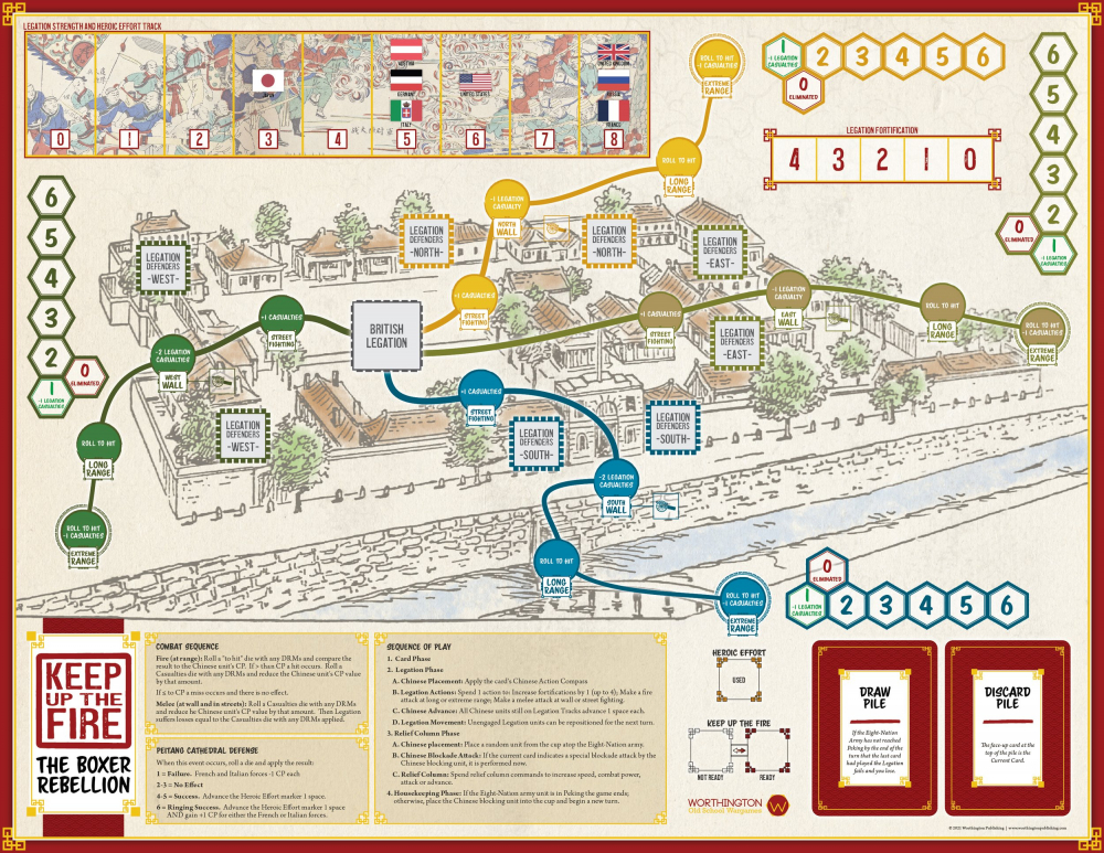 Keep Up The Fire ! est un jeu de solitaire qui se déroule à Pékin en 1900, en Chine. Vous êtes aux commandes des légations étrangères (ambassadeurs, leurs familles, personnel et petites forces de sécurité) dans les zones assignées aux puissances impériales et d'une colonne de secours venant à leur secours. Une révolution anti-impérialiste balaie la Chine et votre présence est devenue le point de convergence des "Boxers" chinois (Société des Poings Harmonieux) et des forces impériales mandchoues de l'armée Qing qui sont en colère et déterminées à expulser tous les étrangers de Chine.