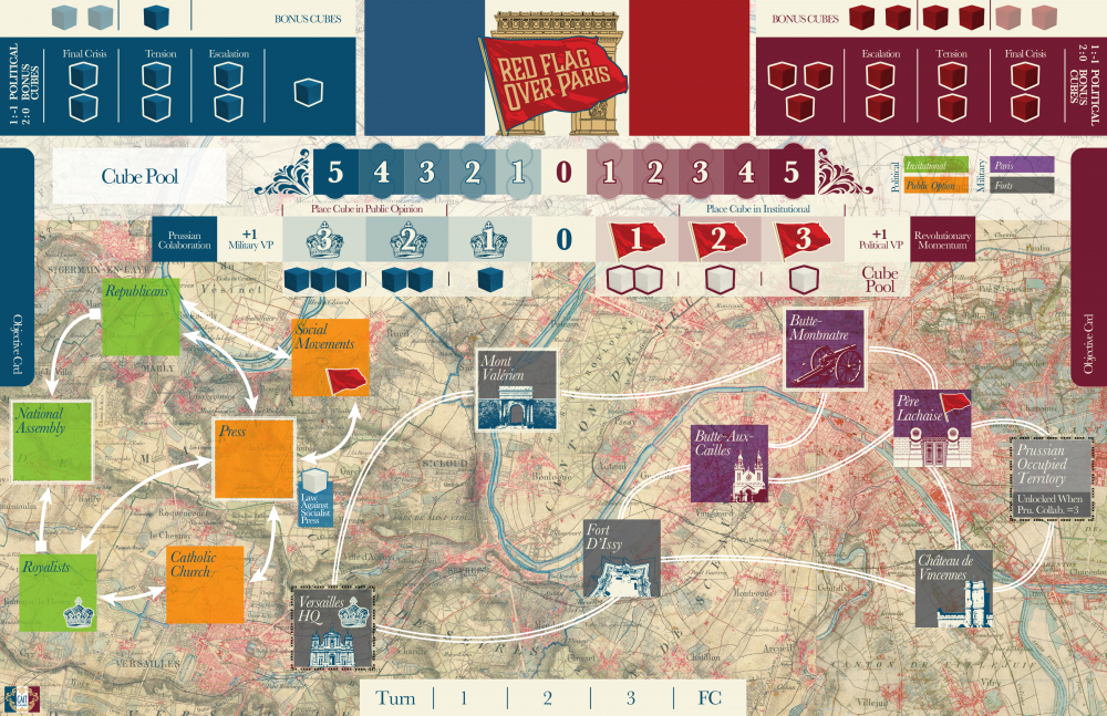 Red Flag Over Paris, le successeur spirituel de Fort Sumter de Mark Herman, est un jeu de cartes à deux joueurs, court mais stimulant, qui décrit les deux mois de confrontation intense entre les communards et le gouvernement de Versailles pendant la Commune de Paris de 1871. Vous incarnerez l'une de ces factions et lutterez pour le contrôle de Paris. Mais vous devrez également gagner les cœurs et les esprits de la population française, car le plateau est divisé en deux zones - militaire et politique - elles-mêmes divisées en plusieurs dimensions (Institutions politiques, Opinion publique, quartiers de Paris, et les forts à la périphérie de la ville). Le jeu oblige les joueurs à prendre des décisions difficiles, comme savoir quand se concentrer sur l'influence politique ou la domination militaire et comment optimiser des ressources limitées.