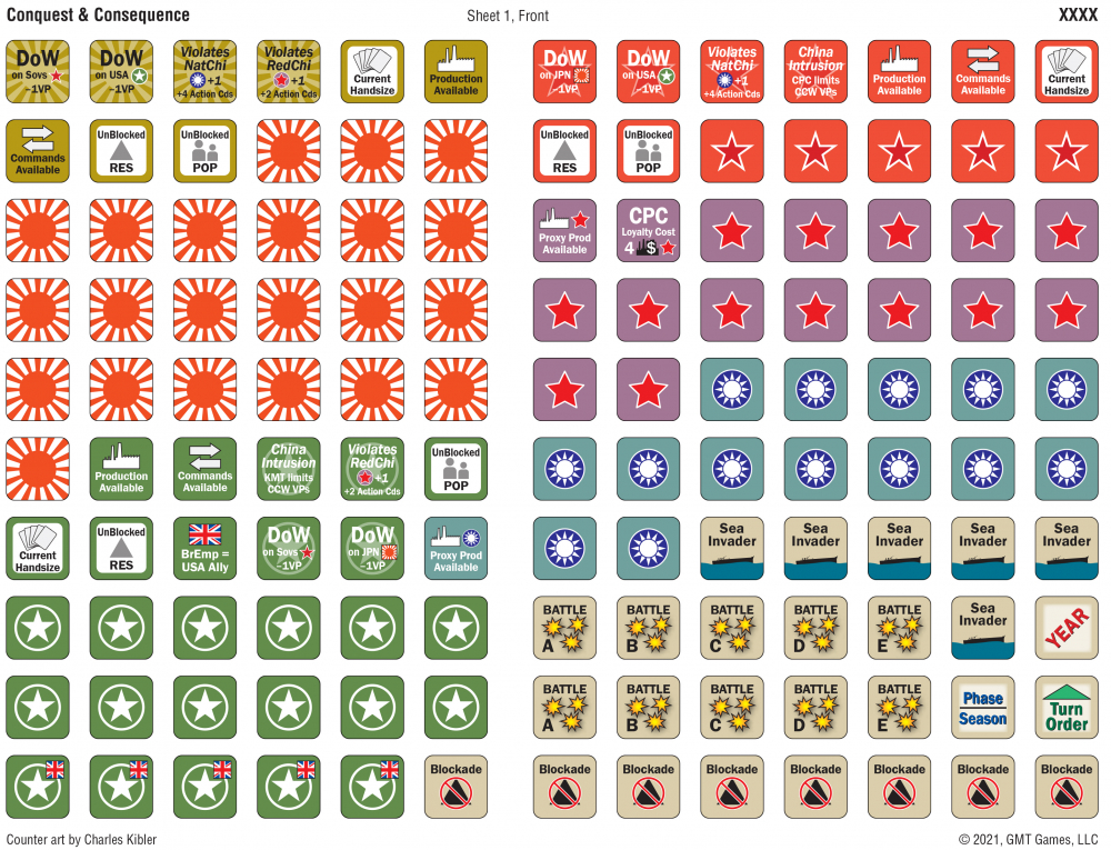 Conquest and Consequence apporte le système Triumph and Tragedy au théâtre du Pacifique/Asie de l'Est pendant la même période 1936-1945. Comme T&T, il est conçu pour 3 joueurs, maintenant la dynamique à 3 côtés qui ajoute tant de variété et d'intrigue au système.