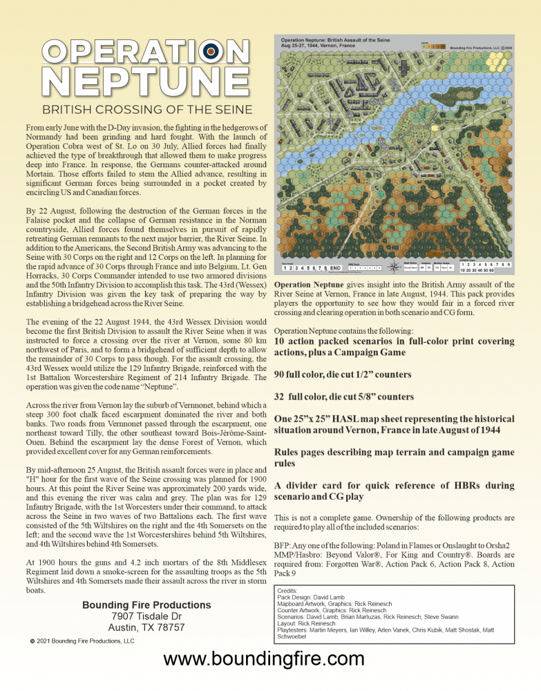 L'opération Neptune donne un aperçu de l'assaut de l'armée britannique sur la Seine à Vernon, en France, à la fin du mois d'août 1944. Ce pack offre aux joueurs l'opportunité de voir comment ils s'en sortiraient lors d'une traversée en force de rivière et d'une opération de nettoyage, à la fois sous forme de scénario et de Campaign Game.
