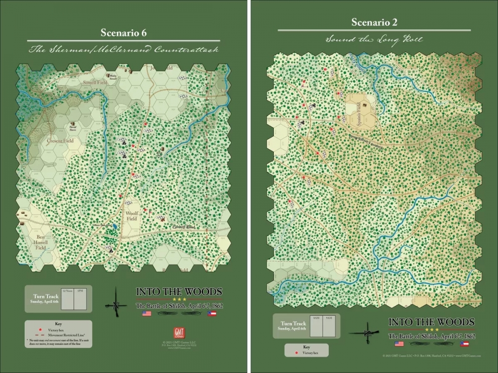 Into the Woods : the Battle of Shiloh comprend dix scénarios. Ils vont des combats au niveau de la division sur des cartes de taille réduite aux batailles sur deux cartes décrivant le premier et le deuxième jour de la bataille. Les joueurs expérimentés pourront jouer la plupart des scénarios en une seule séance. Le jeu reflète la surprise des Confédérés, la "jeunesse" de nombreuses unités des deux côtés, ainsi que le rôle unique joué par Albert Sidney Johnston dans l'attaque confédérée.