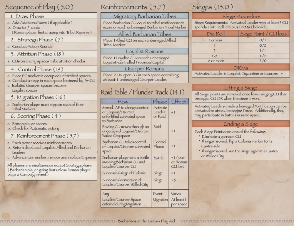 Les joueurs jouent des cartes à tour de rôle afin d'activer des généraux (des généraux romains loyalistes comme Aetius, des empereurs usurpateurs comme Magnentius et des chefs barbares comme Atilla ou Alaric) pour des déplacements et/ou des sièges, de mettre en jeu de nouvelles invasions barbares, de recruter de nouvelles légions, de mener des bandes barbares à faire des raids à travers la frontière vers l'intérieur des terres romaines, d'installer des tribus autrefois hostiles sur le sol romain, ou même de réussir à usurper le trône impérial à son précédent occupant ! En se déplaçant, les chefs rencontreront des armées ennemies et se battront, gagnant la gloire éternelle ou une tombe méconnue. Les tribus barbares sonderont la frontière fortifiée à la recherche de faiblesses, tandis que les légions en infériorité numérique devront utiliser les lignes intérieures (et l'excellent réseau routier romain) pour faire face à chaque menace dans le diocèse italien, ibérique et gaulois non fortifié.