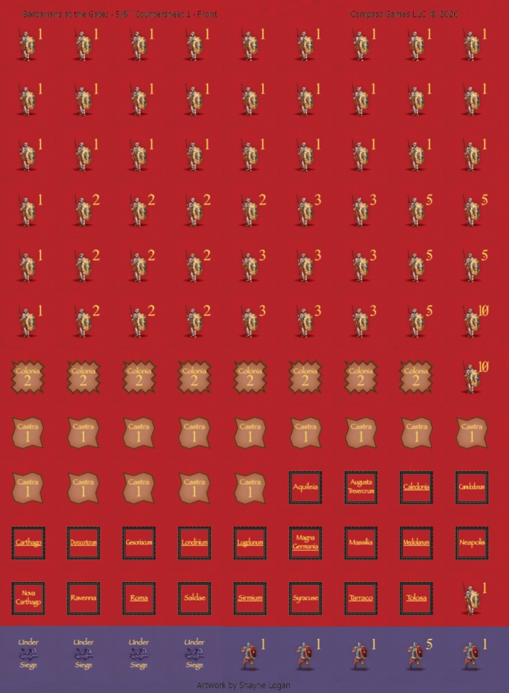 - 110 cartes de stratégie (deux jeux séparés de 55 cartes chacun pour le joueur romain et le joueur barbare)