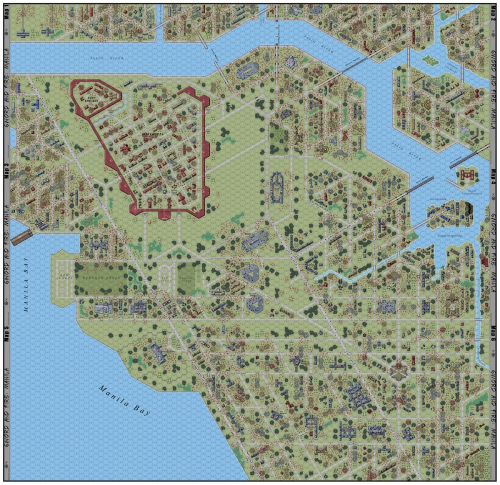 Sword and Fire: Manila propose des règles pour les types de terrains uniques de la ville, tels que les bâtiments multi-matériaux, en adobe et en acier, les monuments en pierre, les cratères de bombes, les nombreux éléments détaillés d'Intramuros, et bien d'autres encore. Vingt-cinq scénarios et cinq jeux de campagne (GC) - dont la taille varie de 6 à 15 dates de GC - se déroulent sur les six feuilles de carte représentant la ville.