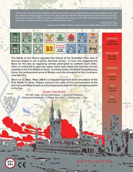 Death of an Army, Ypres 1914 est une simulation au niveau de la brigade/du régiment de la première bataille d'Ypres. Les joueurs assument les rôles des commandants des troupes allemandes et alliées qui se battent désespérément pour cette précieuse position en ligne.