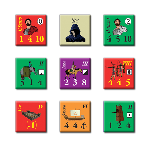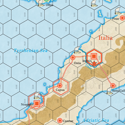 La première guerre punique (264-241 av. J.-C.) est un wargame à deux joueurs sur le premier grand affrontement militaire entre la République romaine et l'Empire carthaginois, qui s'est déroulé sur 24 ans au IIIe siècle av. À cette époque, Rome contrôlait une fédération d'États en Italie, tandis que Carthage était la principale puissance de la Méditerranée occidentale. La guerre était centrée sur l'île de Sicile, mais a également vu des campagnes en Sardaigne et en Afrique du Nord, avec la possibilité d'autres opérations ailleurs dans la région. Chaque tour de jeu (GT) représente trois ans. Chaque hexagone a une largeur de 40 miles. Les unités de combat romaines représentent des légions plus la cavalerie attachée (4000 à 5000 hommes) et des groupements d'auxiliaires (1000 hommes ou plus). Les unités carthaginoises représentent des groupes de divers types de troupes représentant 1000 à 10 000 hommes. Les unités navales représentent environ 50 navires de guerre chacune. Les chefs représentent un commandant inspirant à compétent plus une garde.