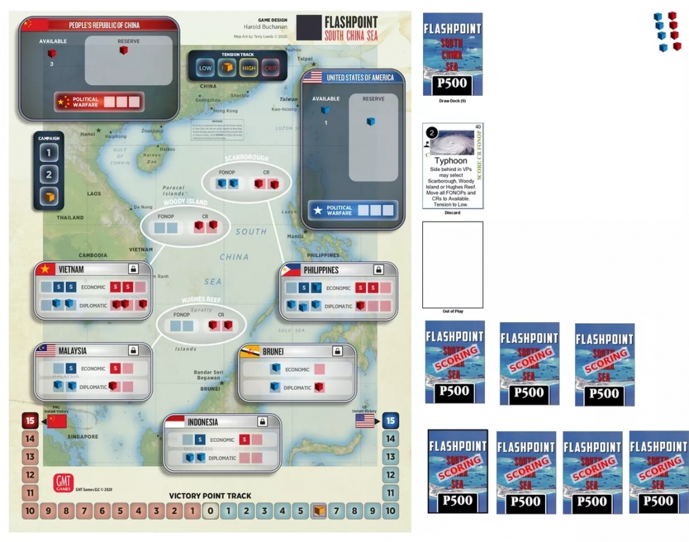 Flashpoint : South China Sea est un jeu de stratégie à deux joueurs qui simule la lutte géopolitique complexe qui se déroule actuellement entre les États-Unis et la Chine dans une région contestée de la mer de Chine méridionale. Le jeu s'appuie sur un jeu de cartes qui présente des développements tirés directement des titres de l'actualité, renforcé par des cartes qui donnent une lecture contextuelle de l'histoire récente, et un ensemble de cartes spéculatives qui présentent un large éventail d'événements futurs potentiels.