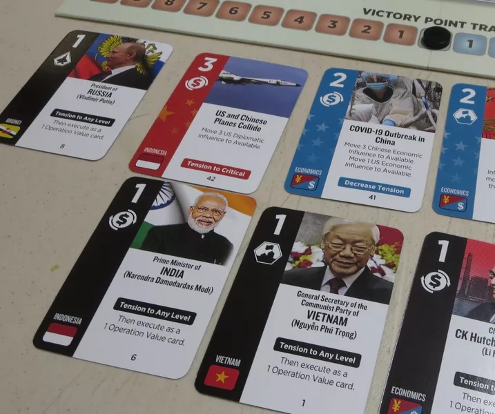 - Le joueur chinois doit s'efforcer d'améliorer la position de la Chine dans le monde, ce qui lui permet d'accroître son influence à mesure que sa position dans le monde augmente. Le joueur américain peut gagner en réduisant la position mondiale de la Chine à un niveau critiquement bas.