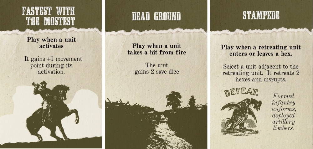 Les cartes de bataille introduisent un élément d'incertitude et d'excitation dans le jeu. Des fiches hors carte permettent de suivre les réserves et les pertes de chaque brigade. Une fois que les réserves d'une unité sont épuisées, celle-ci devient épuisée et risque de se briser.