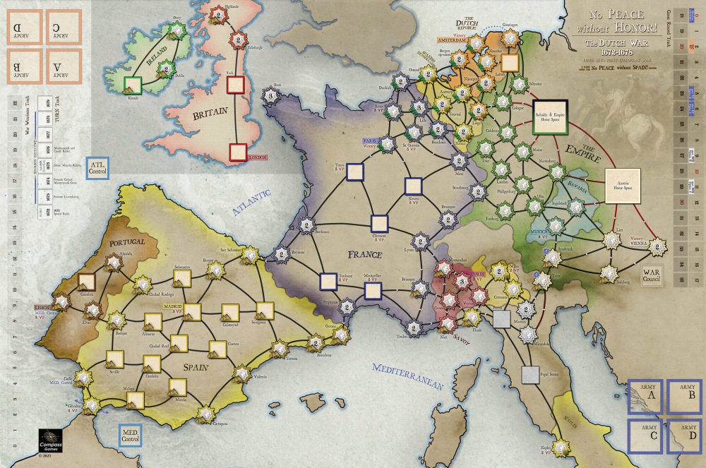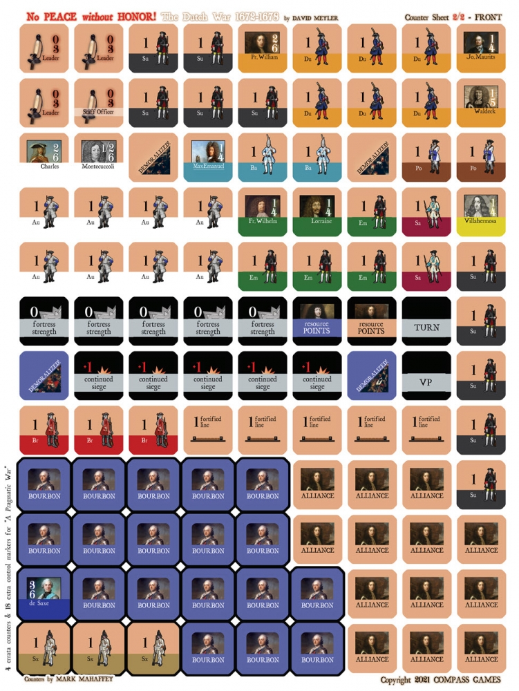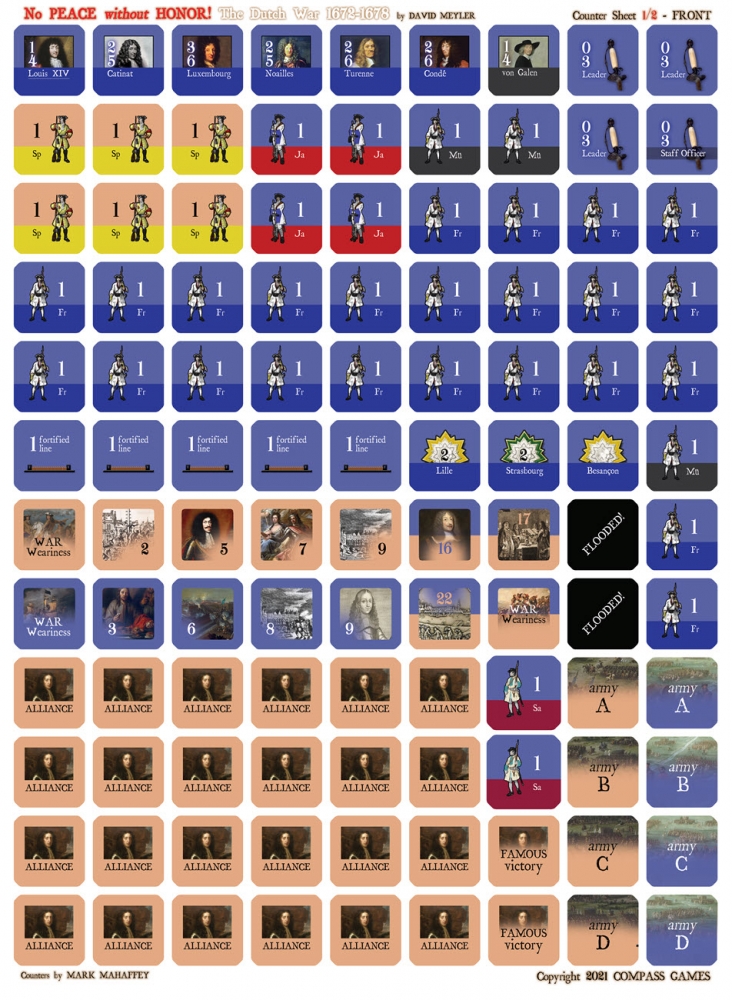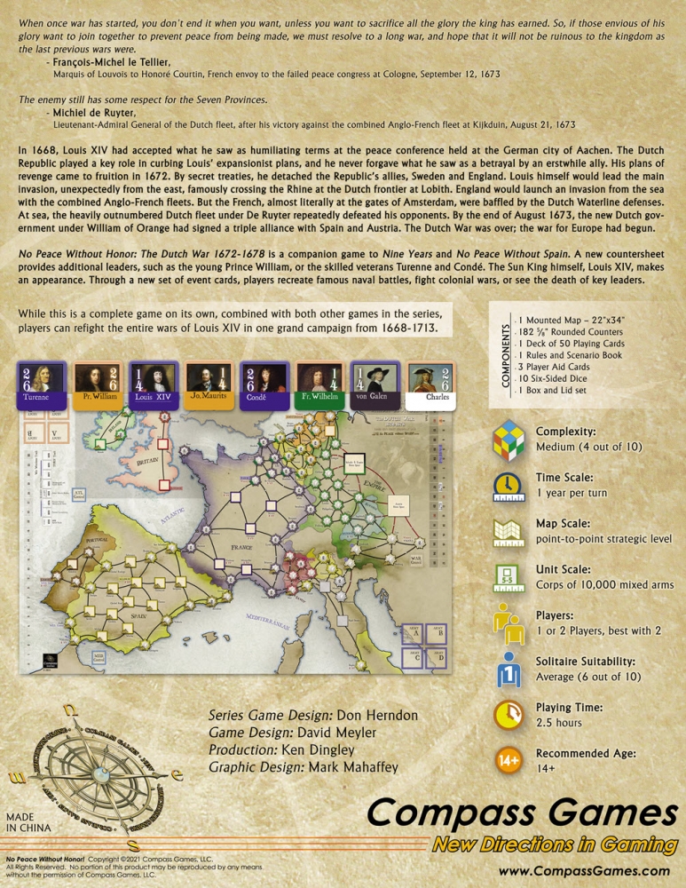 No Peace Without Honor (NPWH) est un jeu à deux joueurs représentant les premières guerres européennes de Louis XIV, la guerre de Dévolution 1667-68, la guerre de Hollande 1672-78 et la guerre des Réunions 1679-1684. Ce jeu autonome utilise le système "No Peace Without Spain". L'accent est mis sur l'invasion soigneusement planifiée de la République hollandaise par Louis, qui était prévue comme un conflit court et tranchant, similaire à la guerre de Dévolution. Cependant, le conflit s'est transformé de manière inattendue en une conflagration paneuropéenne à laquelle aucun des participants n'était préparé. Ce jeu, par le biais de l'option Guerre des Réunions, peut être lié à la Guerre de Neuf Ans et à Pas de Paix sans l'Espagne pour jouer l'ensemble des 46 ans des guerres de Louis XIV sous la forme d'un grand jeu de campagne.