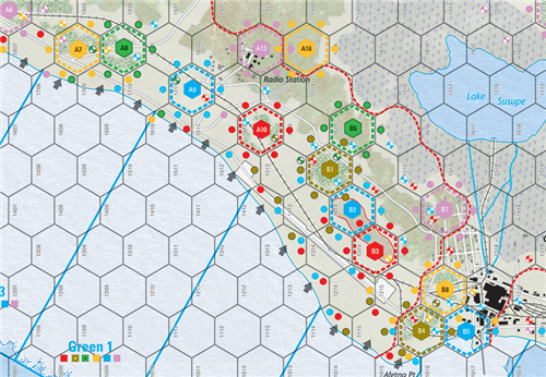 - Campagne Ce scénario combine tous les scénarios précédents en un seul scénario qui englobe l'action des cinq premiers jours. Le scénario de campagne englobe les 16 tours de jeu.