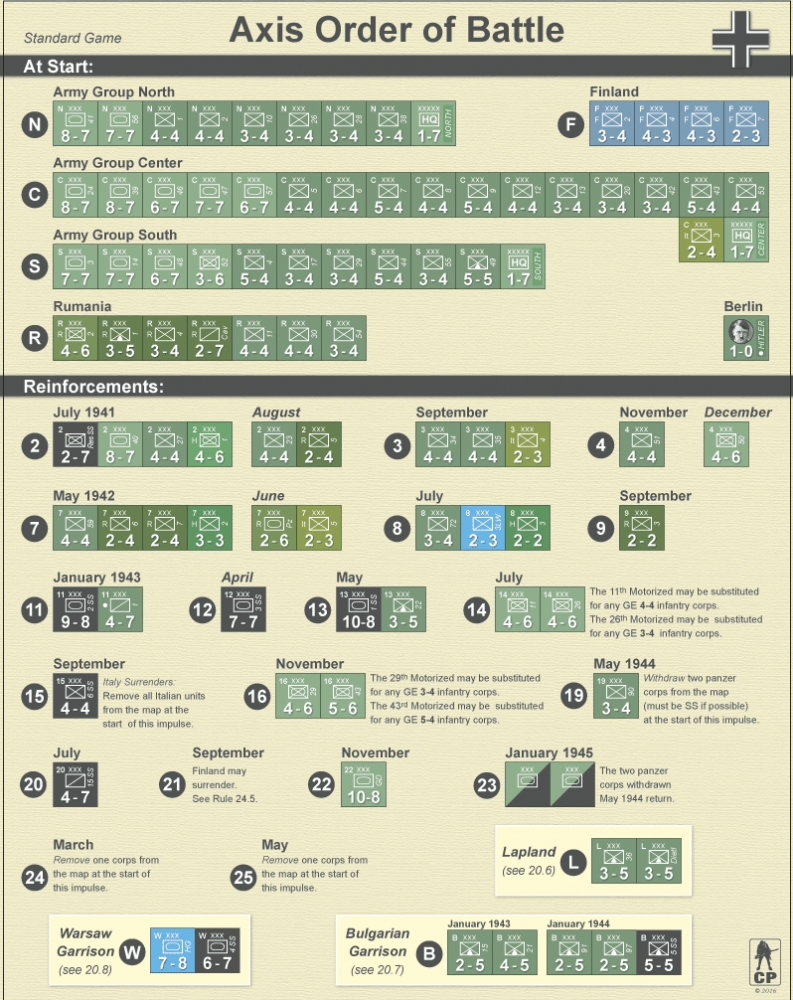 - Nombreuses règles optionnelles comprenant : Mouvement stratégique, réapprovisionnement SS, récupération russe, évacuation industrielle, villes forteresses, météo historique, groupements tactiques, artillerie, barrage d'artillerie russe, unités ouvrières optionnelles, restrictions nationales, restrictions navales historiques, neutralité hongroise, enchères compétitives pour les camps.
