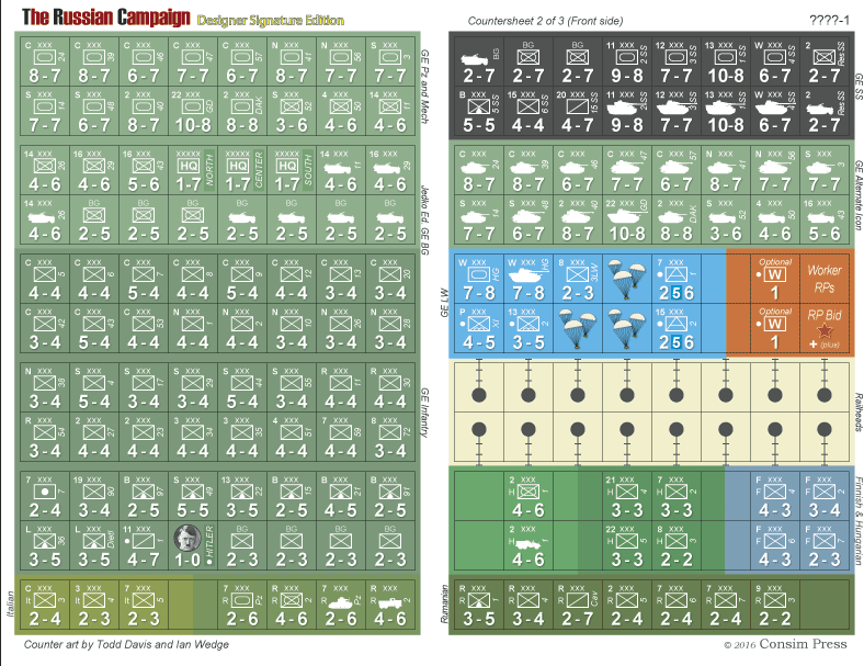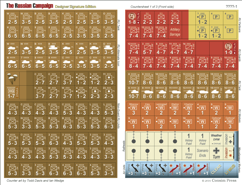 Bien que notre objectif principal soit de capturer la forme la plus pure de la Campagne de Russie (selon les Règles de Jeu Standard), des règles et des pions de jeu provenant des meilleurs suppléments publiés depuis de nombreuses années sont également inclus - avec du matériel provenant de Moves #79, BattlePlan #1, TAHGC/General Richard Hamblem "What-if" material, Jedko II game edition, et The Polish Uprising variant by Kim Meints, pour n'en citer que quelques-uns. Des commentaires d'experts pour toutes les règles optionnelles et variantes sont fournis pour aider les joueurs à comprendre le motif sous-jacent de chacune de ces règles et leur impact sur l'équilibre du jeu. Et la meilleure nouvelle de toutes, nous avons fourni tous les pions nécessaires pour accompagner ces variantes de jeu. Nous fournissons également une carte spéciale qui supprime les trois hexagones de montagne au sud-est de Lwow afin qu'ils puissent être traités comme du terrain clair selon l'une des règles optionnelles.