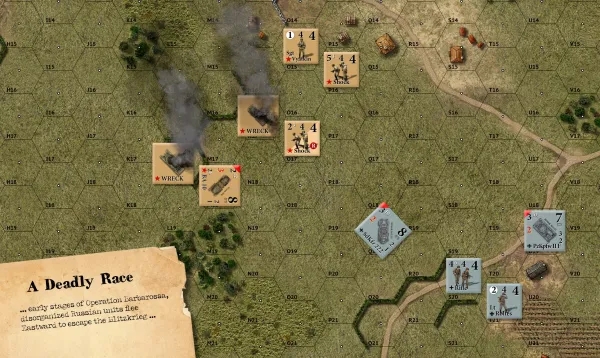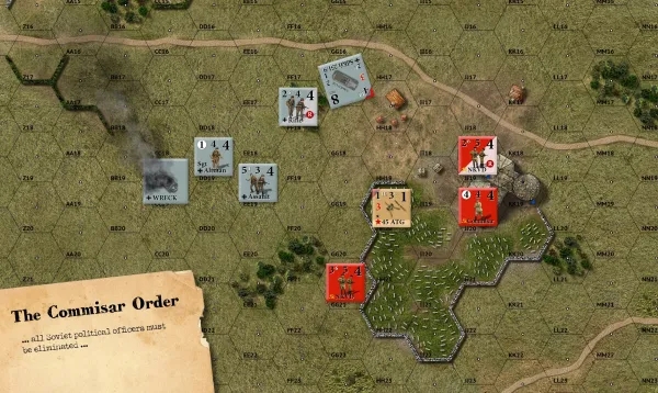 L'infanterie cible d'autres unités molles et attaque en utilisant sa valeur de puissance de feu contre la valeur de défense de la cible. L'attaque peut être modifiée par le leadership, les armes de soutien et les effets du terrain. Et lorsque les choses deviennent intenses, les mouvements d'assaut dans les hexagones ennemis entraînent un corps à corps mortel. Les dés sont lancés à l'aide de la table de combat d'infanterie et les résultats sont appliqués. L'attaque de véhicules blindés nécessite un jet pour toucher le véhicule à distance. Si une touche est obtenue, la valeur de puissance de feu du canon de l'attaquant est utilisée contre la valeur de défense avant ou latérale de la cible. Les jets de dés sont effectués en utilisant la table de combat des véhicules et les résultats sont appliqués. Les véhicules peuvent également utiliser leur puissance de feu HE et leurs armements secondaires directement contre des cibles molles en utilisant la table de combat d'infanterie.