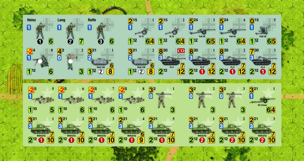 Combat de chars : Le combat de chars à cette échelle est l'aspect le plus difficile de la modélisation du combat de petites unités. Dans la plupart des jeux tactiques, le combat de véhicules prend généralement la forme d'un tir défensif ou d'une activité de mouvement du véhicule ciblé pendant le tour du joueur "J'y vais". Mais cette approche pose quelques problèmes. Tout d'abord, les tirs défensifs souffrent du problème de la "connaissance parfaite". Le véhicule ciblé repère toujours la menace. Parfois, voire souvent, le véhicule cible n'a pas la possibilité de tirer sur son assaillant pour la simple raison que l'équipage du véhicule cible ne sait pas que l'ennemi est là. On ne voit pas grand-chose d'un char d'assaut boutonné sur un champ de bataille où éclatent des explosions retentissantes et où les obus à haute vélocité font trembler des vies humaines. Le char qui tue les vôtres est souvent celui que l'on n'a jamais vu. Deuxièmement, les humains ne possèdent pas une vision à 360 degrés. L'acte de "regarder tout autour" prend du temps et, pendant ce temps, un projectile peut être en route pour tuer votre véhicule. Regarder à droite signifie que vous ne regardez pas à gauche pendant un certain temps, et dans ce laps de temps, la mort peut s'abattre sur vous. Dans The Last Hundred Yards, le concept traditionnel de tir défensif a donc été remplacé par une séquence de réaction qui peut permettre au véhicule cible d'échapper à son chasseur et, dans certains cas, de transformer le chassé en chasseur.