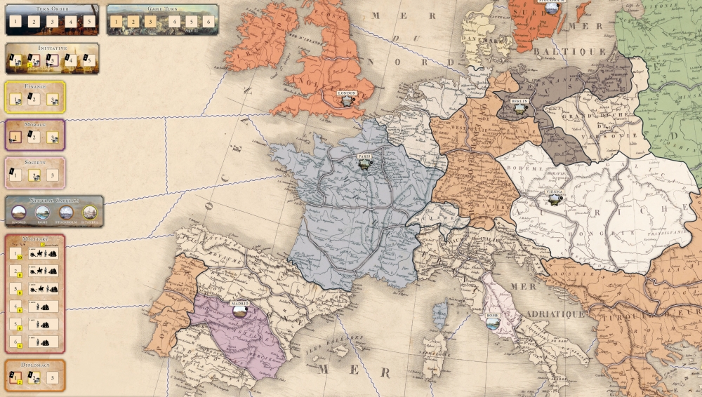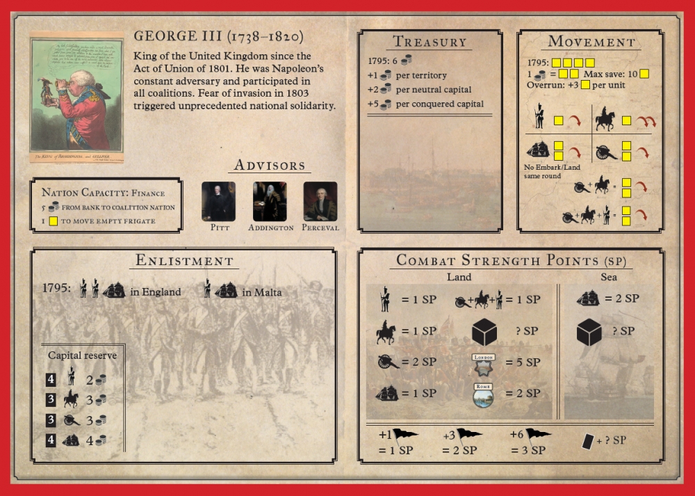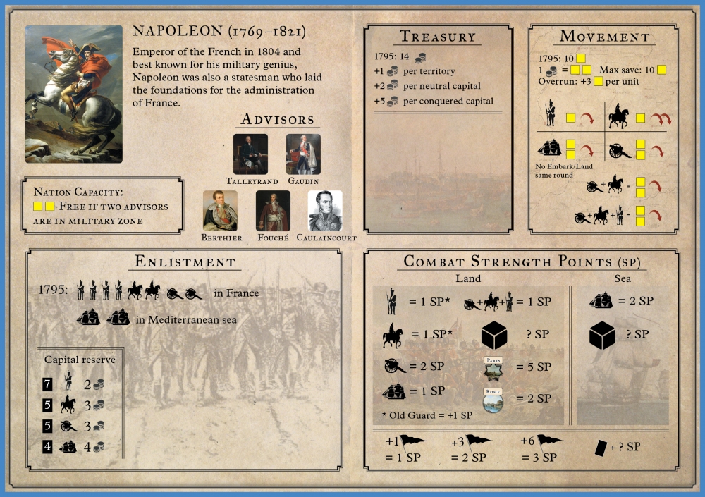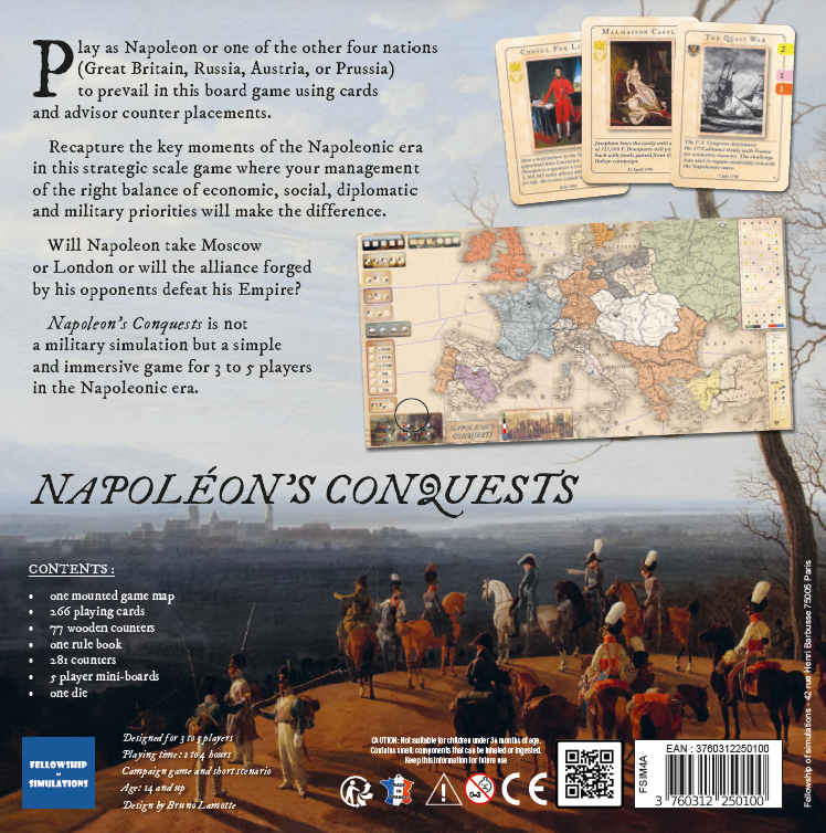 Play as Napoleon or one of the other four nations (Great Britain, Russia, Austria, or Prussia) to prevail in this board wargame using cards and advisor counter placements. Recapture the key moments of the Napoleonic era in this strategic scale game where your management of the right balance of economic, social, diplomatic and military priorities will make the difference. Will Napoleon take Moscow or London or will the alliance forged by his opponents defeat his Empire? Napoleon's Conquests is not a military simulation but a simple and immersive game for up to 5 players in the Napoleonic era.