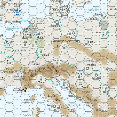 Le jeu suppose que les Alliés occidentaux décident d'adopter une stratégie "Europe First", détournant les forces et la logistique du Pacifique. L'Axe doit gagner la guerre avant que l'effondrement économique ne s'installe, et les Alliés doivent gagner avant que les Japonais ne s'emparent d'une trop grande partie du Pacifique. Compte tenu de la réorientation de la logistique et de la planification de l'Axe contre l'Empire britannique et les États-Unis, seule l'Union soviétique la plus à l'ouest est représentée sur la carte, mais l'accent est mis sur l'Afrique du Nord et le Moyen-Orient.