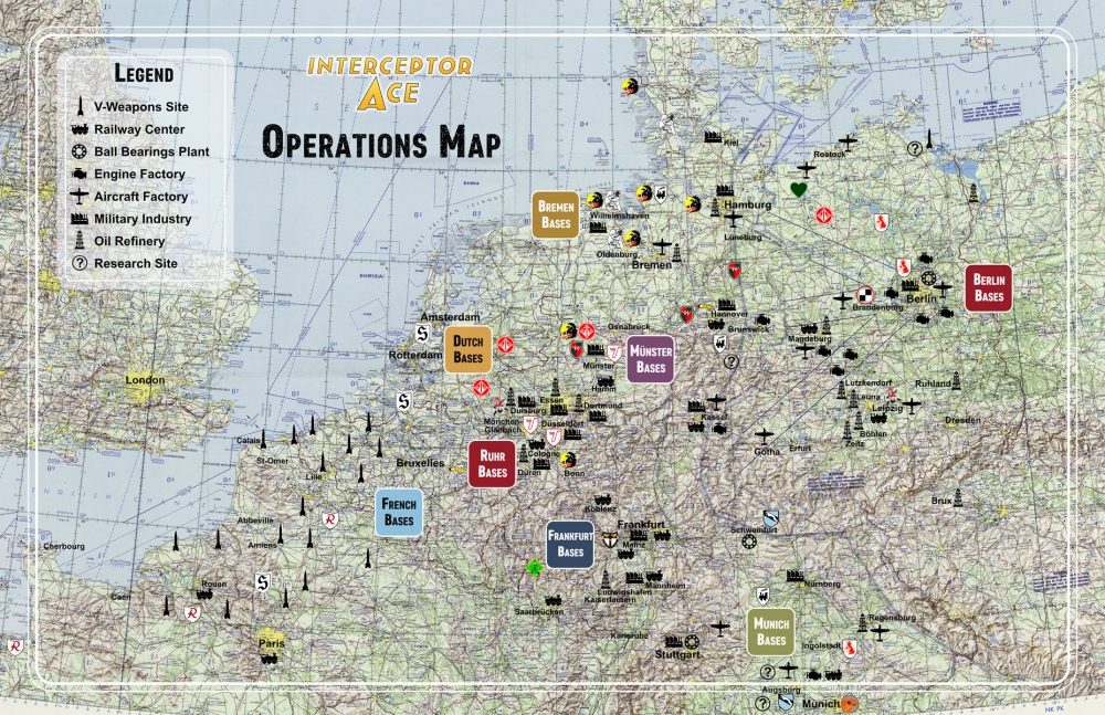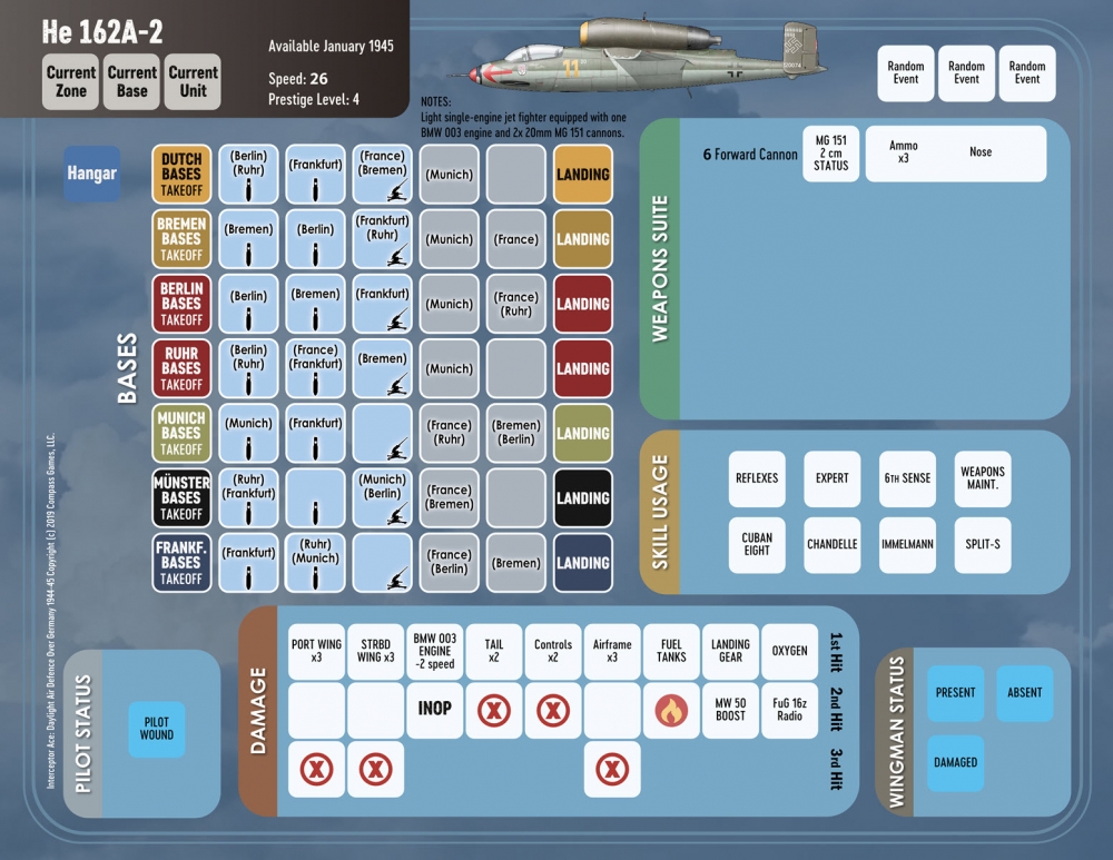 Interceptor Ace, Volume 2 : Last Days of the Luftwaffe, 1944-1945, conçu par Fernando Sola Ramos, est un jeu tactique en solitaire qui vous place aux commandes d'un avion de chasse allemand pendant les derniers jours de la Seconde Guerre mondiale. Il s'agit de la suite du populaire jeu d'action Interceptor Ace 1943-44, conçu par Gregory M. Smith, et reprend l'action là où Interceptor Ace 1943-44 s'est arrêté. Chaque tour se déroule sur plusieurs jours, au cours desquels une mission de combat est menée depuis l'une des nombreuses bases en Europe, pour tenter d'intercepter les bombardiers américains qui arrivent et de se défendre contre leurs escortes. Le pilote est fortement impliqué dans la narration, car il cherche à accroître son prestige, à acquérir des compétences, à monter en grade par le biais de promotions et à recevoir des récompenses.