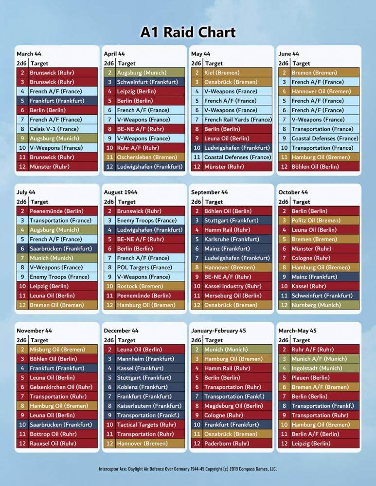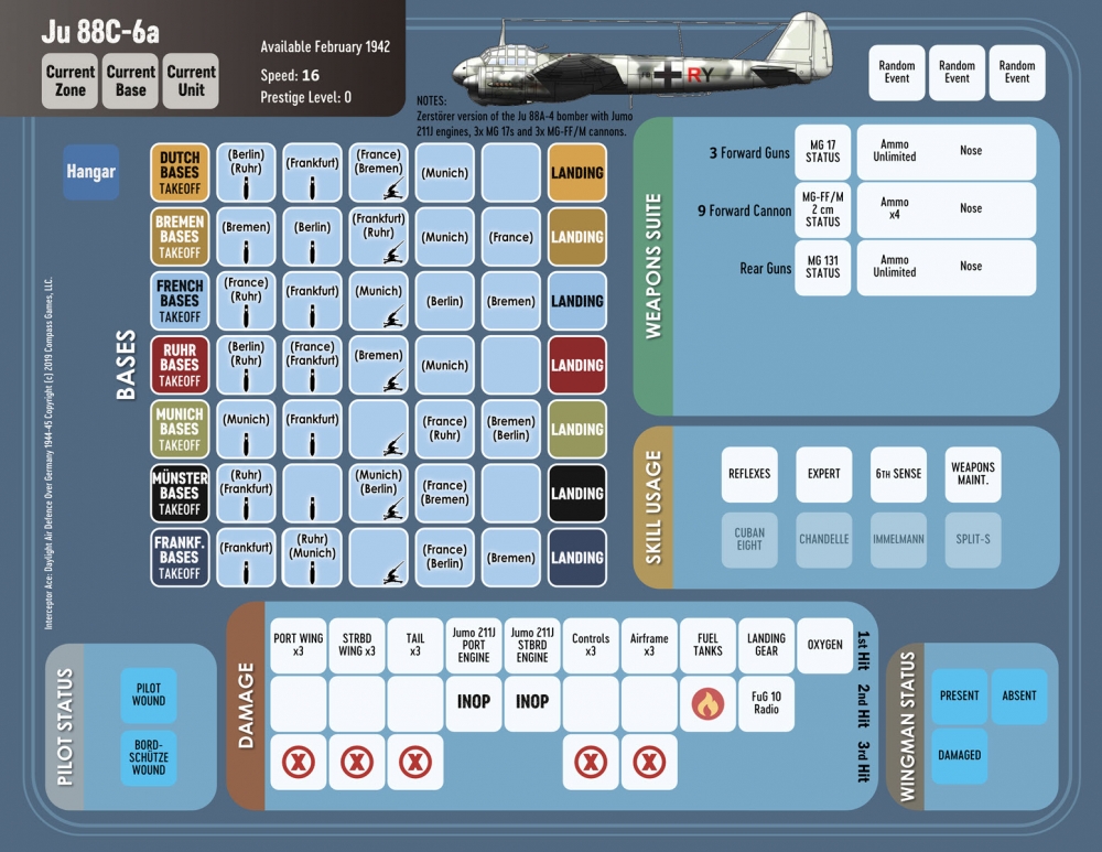Le jeu se déroule rapidement, suivant une séquence d'événements qui se répètent jusqu'à la fin de la partie. Une fois que vous avez votre pilote et votre équipage initiaux, ainsi que votre chasseur, le jeu commence par la vérification des conditions météorologiques de la base et des informations sur les raids en cours avant le décollage. Une fois le décollage réussi, le jeu se poursuit en volant vers la zone où vous pensez intercepter les Américains, tout en essayant d'éviter les chasseurs alliés en maraude. Au fur et à mesure que vous entrez dans les cases de localisation, vous effectuez des jets de dé pour une éventuelle interception au cours de laquelle un combat peut s'ensuivre. Le combat peut consister en de nombreux rounds, après quoi le retour à la base et les opérations d'atterrissage ont lieu, la météo jouant à nouveau un rôle dans le cadre de la procédure d'atterrissage. Une fois la mission terminée, vous vérifiez les récompenses, les points de prestige et les points d'expérience acquis avant la prochaine sortie. Vous pouvez également dépenser des points de prestige et d'expérience pour acquérir des compétences, demander un nouveau chasseur ou un changement de base. Vous répéterez ce processus en effectuant votre prochaine sortie jusqu'à ce que vous soyez abattu et tué, ou jusqu'à ce que la guerre prenne fin, si vous vous en sortez indemne.