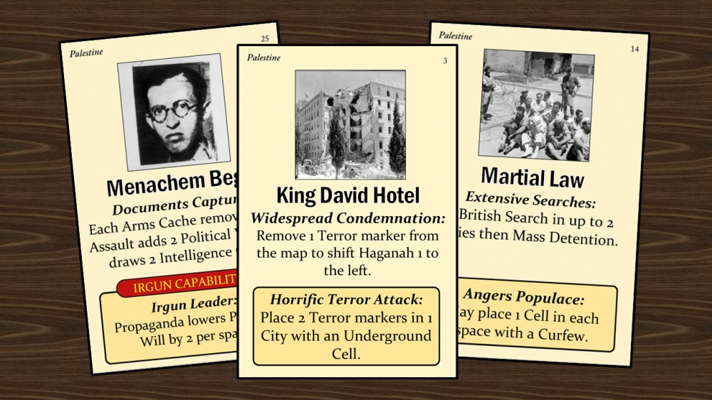 Les deux conflits suivants s'éloignent davantage des concepts de base de la COIN, car les deux adversaires de la Grande-Bretagne à Chypre et en Palestine opéraient comme de petites cellules terroristes clandestines plutôt que comme les grandes insurrections décrites en Malaisie et au Kenya. Au lieu de cela, de nouvelles tactiques de "contre-terrorisme" sont modélisées, telles que les couvre-feux, le renseignement, les caches d'armes et un système de sabotage et de terreur plus détaillé. Ces deux jeux offrent une nouvelle approche d'un type de conflit différent et permettent une expérience de jeu encore plus rapide pour les duels COIN à deux joueurs.