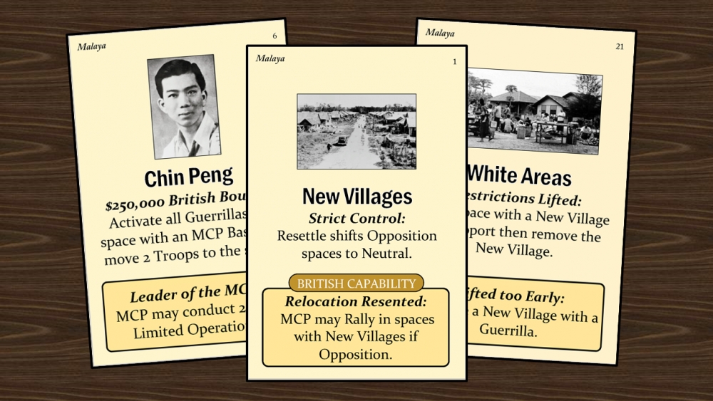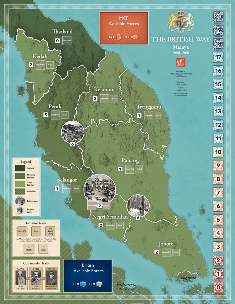 L'état d'urgence britannique en Malaisie (1948-1960) est considéré par certains comme le cas classique d'une campagne contre-insurrectionnelle réussie, menée contre une insurrection dirigée par le parti communiste malais. L'urgence malaise a influencé de manière significative la théorie de la contre-insurrection et est devenue un cas modèle, auquel les commandants ont fait appel par la suite dans des conflits allant du Viêt Nam à aujourd'hui. La voie britannique : Malaya est l'introduction parfaite pour les nouveaux joueurs de la série COIN, offrant une expérience de jeu à deux joueurs plus courte qui permettra aux joueurs de se familiariser avec les factions gouvernementales et insurgées dans d'autres volumes COIN modernes, tels que Cuba Libre ou A Distant Plain. Pour les joueurs expérimentés, il s'agit également d'une bonne introduction aux nouveaux mécanismes de base de The British Way en proposant des factions et des opérations qui seront familières aux volumes COIN précédents, mais avec plusieurs nouveaux systèmes, tels que la piste de volonté politique, une séquence de jeu rationalisée et une capacité de commandant britannique changeante.