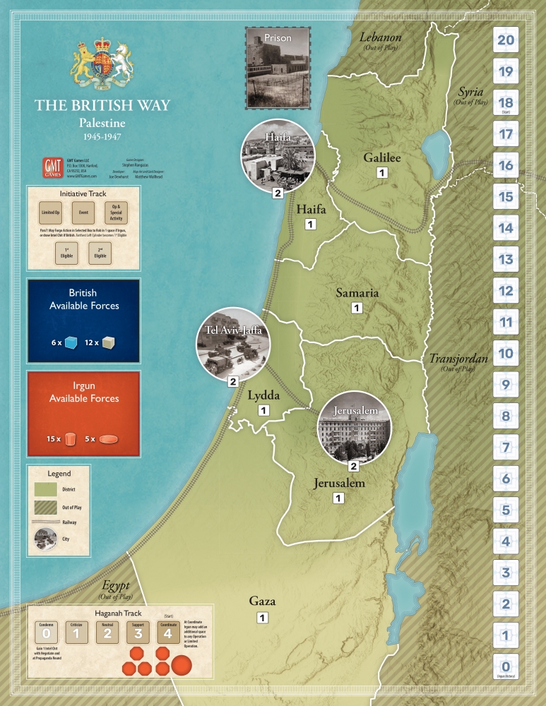 De même, pendant la campagne de Palestine (1945-1947), le joueur britannique devra faire face aux groupes de résistance juifs Irgun et Lehi qui lancent des sabotages et des attaques terroristes dans toute la Palestine mandataire, tout en risquant les critiques des États-Unis et d'autres observateurs internationaux si leur réponse est trop musclée. La voie britannique : Palestine développe davantage les nouveaux mécanismes de lutte contre le terrorisme introduits à Chypre, tout en incluant des systèmes de jeu uniques pour modéliser l'utilisation par les Britanniques de l'outil contondant qu'est la détention de masse, la coopération changeante de la Haganah (la branche armée de l'Agence juive) et les attaques terroristes de grande envergure telles que l'attentat à la bombe de l'hôtel King David.