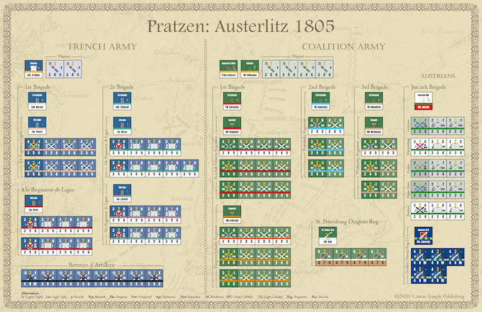 The Pratzen : Austerlitz 1805 est un jeu de plateau pour deux joueurs qui décrit les combats sur et autour des hauteurs de Pratzen lors de la bataille d'Austerlitz. La bataille a opposé les forces françaises de Napoléon Bonaparte à une armée alliée plus importante composée de forces autrichiennes et russes. La bataille est considérée comme l'un des engagements les plus importants et les plus décisifs des guerres napoléoniennes. Le résultat de l'engagement a mis fin à la guerre de la Troisième Coalition et a abouti au traité de Presbourg. La bataille est largement considérée comme un chef-d'œuvre tactique au même titre que Cannae.