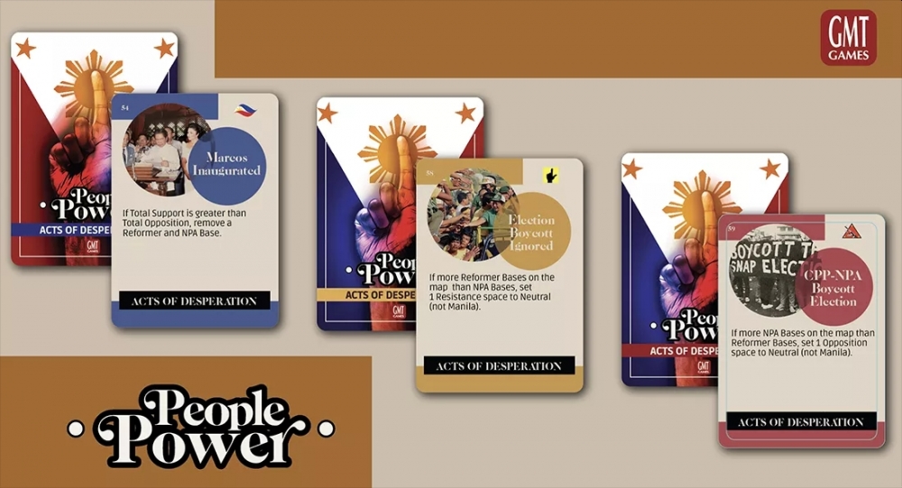 - Le paquet Actes de désespoir sert à modéliser les trois derniers jours chaotiques de la révolution du Pouvoir du Peuple en donnant aux joueurs des objectifs secrets qui sont marqués lors du test de victoire final.