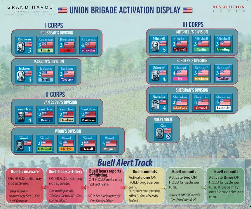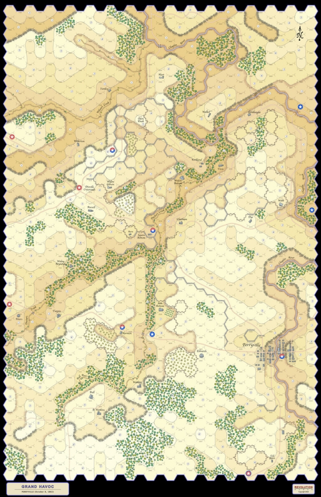 Un jeu du système Blind Swords sur la bataille de Perryville (Kentucky) de la guerre civile américaine en 1862. Le système Blind Swords utilise des chit pulls et des jets d'activation pour simuler la confusion du commandement et la difficulté de coordonner les armées du 19ème siècle. De plus, à chaque tour, un certain nombre d'événements peuvent avoir un impact sur la capacité des armées à mettre en œuvre leurs plans. Les unités de base sont des régiments d'infanterie ou de cavalerie et des batteries d'artillerie qui sont évalués en fonction de leur taille, de leur armement et de leur cohésion/morale.