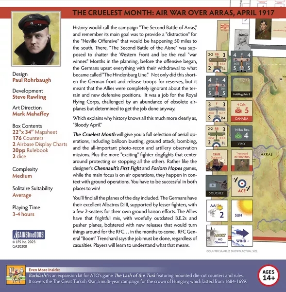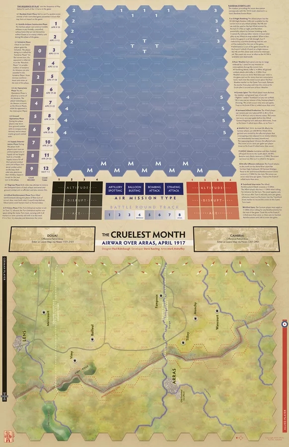 Bien que les pertes aériennes soient dérisoires par rapport aux milliers de morts au sol, ces actions aériennes ont eu un impact considérable sur la façon dont les choses se sont déroulées au sol. Le mois le plus cruel vous offrira une sélection complète d'opérations aériennes, y compris l'éclatement de ballons, l'attaque au sol, le bombardement et les très importantes missions de photo-recon et d'observation d'artillerie, ainsi que les combats de chasseurs centrés sur la protection ou l'arrêt de toutes les autres missions. Pour ces combats, vous utiliserez une carte de combat aérien et vos avions interagiront avec les forces terrestres sur une carte de la région d'Arras.