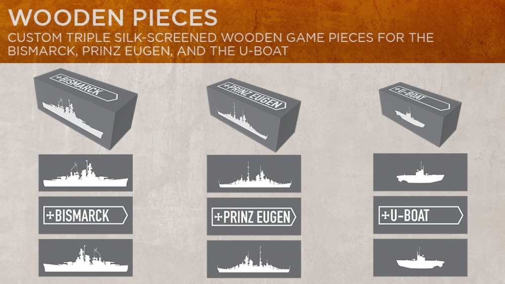 Le jeu de plateau utilise le même système de jeu que le livre-jeu, mais comporte les éléments tactiles traditionnels des jeux de plateau. Il comporte des pièces en bois pour représenter les navires et un grand plateau de jeu double face monté sur support rigide pour le tableau de recherche et les actions du jeu. Un côté du plateau de jeu est réservé à la chasse au Bismarck et l'autre à la bataille du détroit de Danemark.