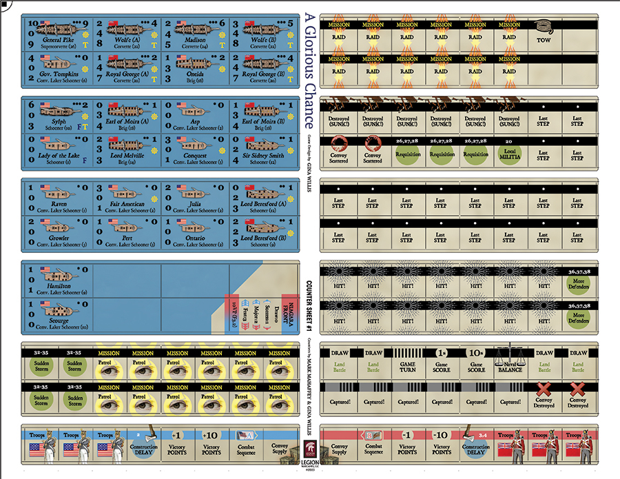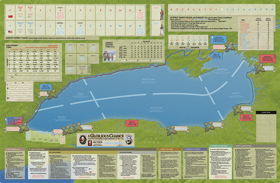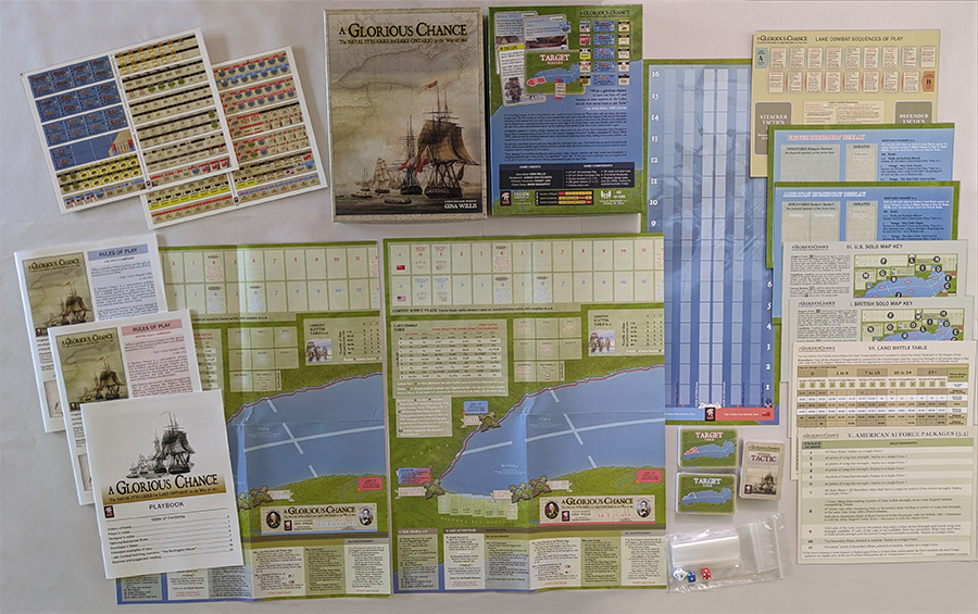 Description de la mécanique : A Glorious Chance comporte huit tours représentant la période juin-septembre 1813, et peut être joué en quatre heures environ. À chaque tour, le joueur humain affecte des navires ou des piles de navires amis à des missions de patrouille, d'escorte de convoi, de soutien terrestre ou d'interception dans l'une des six zones lacustres. Les tirages de cartes et de jetons déterminent quels navires ennemis peuvent être déployés sur le lac ou rester au chantier naval pour acquérir des armes plus puissantes. Le joueur tire une rangée de cartes Cible, face cachée. Chaque dos de carte indique une zone du lac où l'ennemi peut être actif ce tour-ci. Si la zone d'une carte correspond à une zone avec une mission amie, une rencontre est possible. Lors d'une rencontre, la carte Cible est retournée pour révéler le type de mission et le niveau d'effort de l'ennemi, ce qui permet de déterminer le nombre de navires ennemis qui apparaîtront. Les combat navals sont résolus sur une table basée sur des ratios, modifiée par les jetons de tactique tirés/sélectionnés, et peuvent donner lieu à des points de victoire pour les navires ennemis détruits ou capturés. Les navires ayant une mission de soutien terrestre augmentent les chances de succès de leur camp lors d'une attaque terrestre, qui rapporte également des points de victoire. Une phase administrative à la fin de chaque tour détermine quel camp gagne des PV pour le contrôle des zones lacustres, si le port d'attache d'un camp est soumis à un blocus et comment les convois de ravitaillement arrivés, retardés ou capturés affectent la progression de la piste de ravitaillement de chaque camp. Un camp qui atteint certains niveaux de ravitaillement peut lancer certains navires à partir d'un chantier naval ou préparer des troupes pour tenter des opérations terrestres plus ambitieuses.