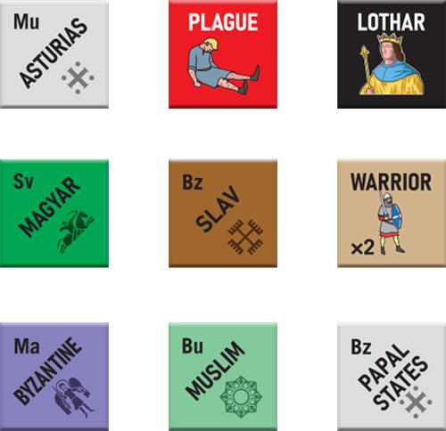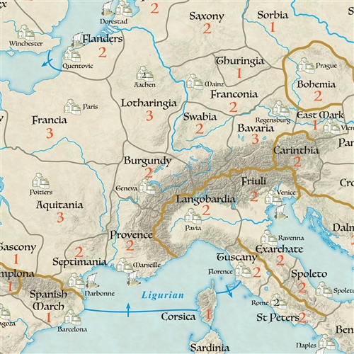 Carolingian Twilight : Déclin d'un empire AD814 est un jeu pour deux à six joueurs couvrant le déclin de l'empire carolingien après la mort de Charlemagne (Charles le Grand) en 814. La loi salique des Francs exigeait qu'à la mort d'un homme, ses biens soient divisés entre tous ses fils, ce qui entraîna des guerres civiles entre les descendants de Charlemagne lorsque l'héritage en question était l'Empire lui-même. Les différents testaments, guerres et traités qui ont divisé et redistribué l'Empire au cours des années 800 ont donné naissance aux États modernes que sont la France, l'Allemagne et l'Italie. Chaque scénario dépeint la période qui suit une division particulière de l'empire, chaque joueur jouant le rôle de l'un des héritiers. Le but du jeu est de réunifier l'Empire sous un seul souverain, tout en repoussant non seulement les rivaux francs, mais aussi les puissances étrangères hostiles qui l'entourent. Chaque tour de jeu représente une année. L'échelle de la carte est d'un pouce pour 75 miles. Chaque zone est une région historique. Chaque unité représente de 100 à 5 000 soldats (plus les partisans du camp, etc.).