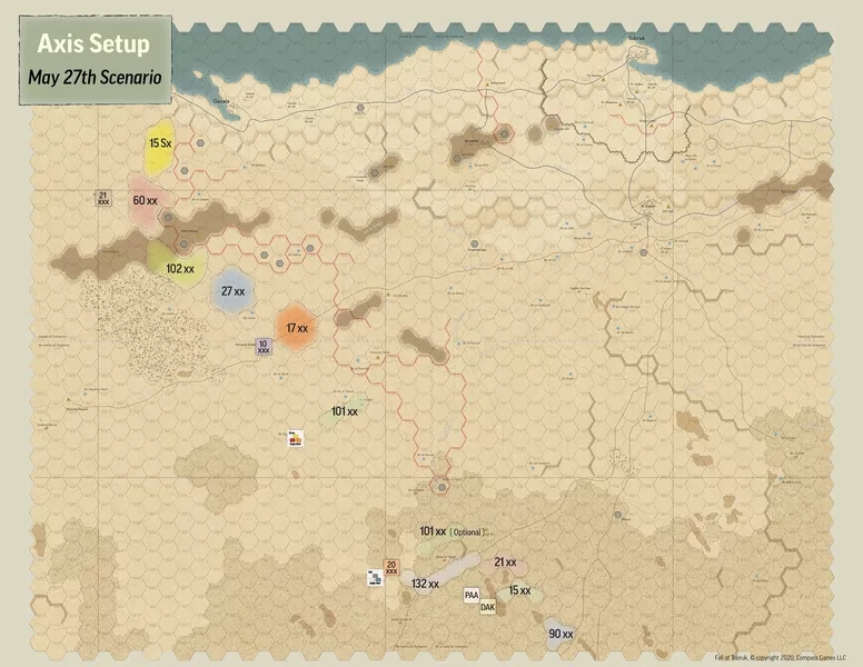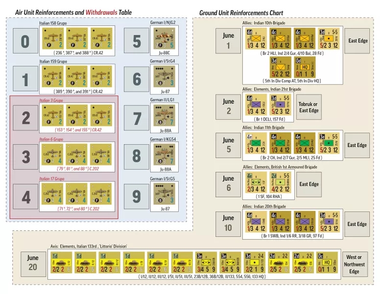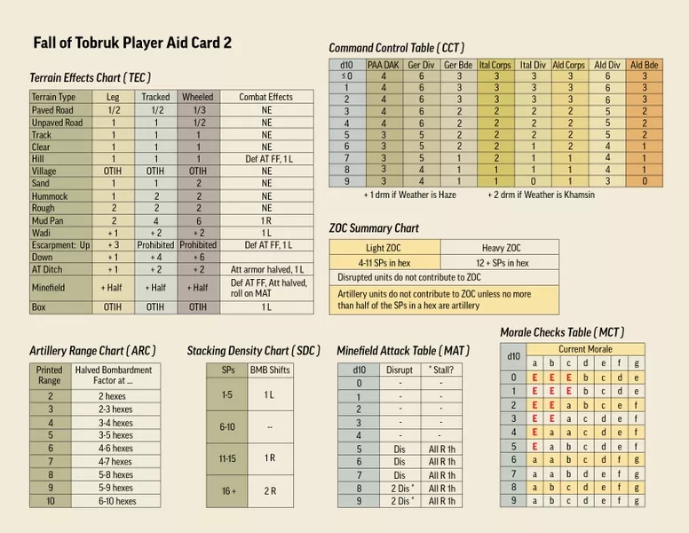 Il s'agit d'une révision complète des jeux de conflit conçus par Frank Chadwick et publiés pour la première fois en 1975 - considérez qu'il s'agit d'un jeu entièrement NOUVEAU et non d'une réimpression d'une édition précédente. Avec des ordres de batailles révisés et largement documentés, la conversion à une méthode de résolution d10, de toutes nouvelles règles météorologiques, de toutes nouvelles règles aériennes montrant la coordination armée-air qui était en train d'être perfectionnée par les deux camps, et une toute nouvelle carte à la moitié de l'échelle terrestre du jeu original (1,5 mi/hex contre 3 mi/hex), et le passage d'un Igo-Yugo à un mécanisme d'activation de la formation par tirage au sort. Mais le changement le plus excitant est une phase d'opérations dynamique dans laquelle les joueurs peuvent décider exactement quand et avec quelles unités ils veulent se déplacer, combattre, faire un barrage ou appeler une frappe aérienne. Il n'y a pas de phase de mouvement, de phase de combat, de phase de tir indirect ou de phase de frappe aérienne fixes... c'est aux joueurs de décider comment ils veulent construire leurs propres tours. Reflète bien le chaos de la guerre dans le désert d'Afrique du Nord.