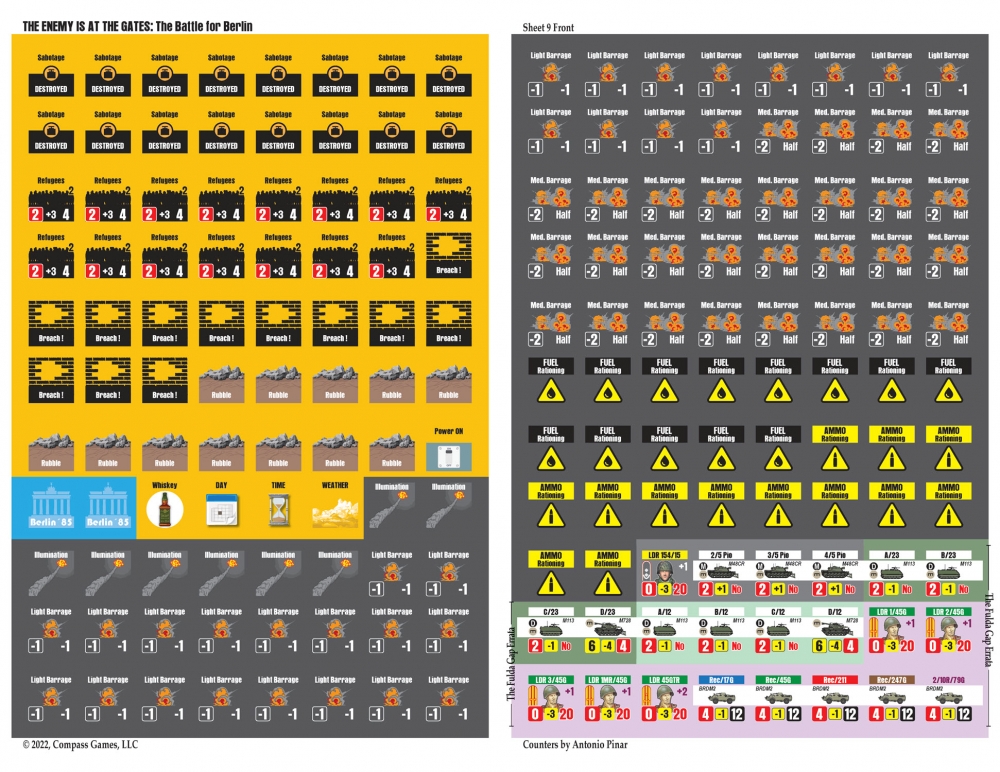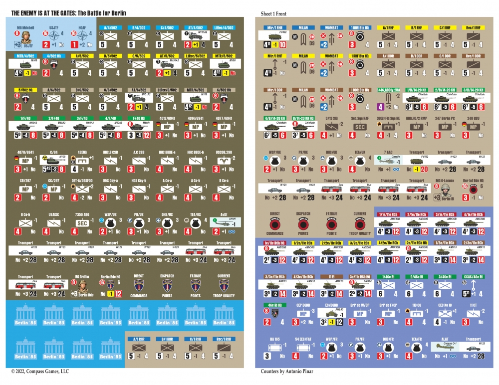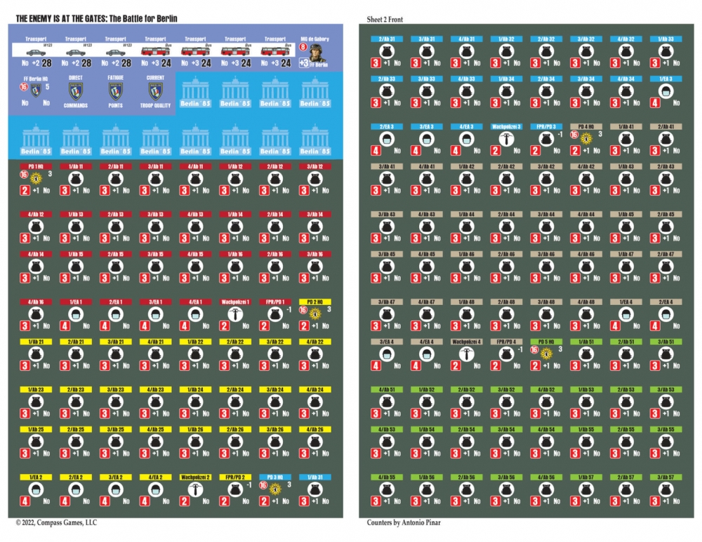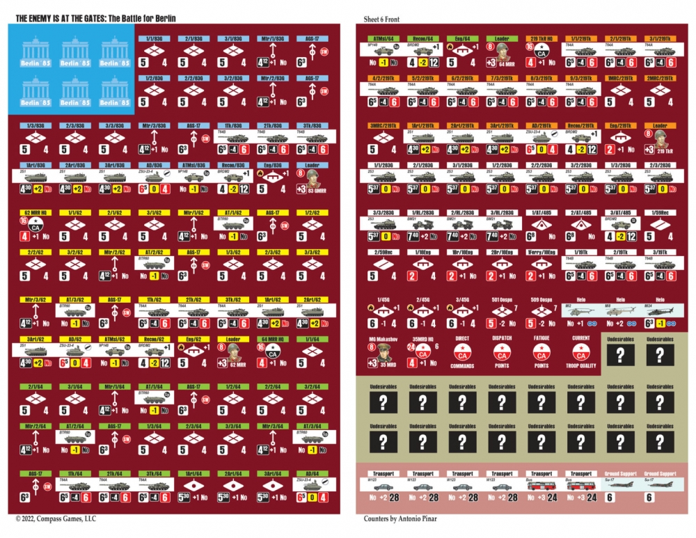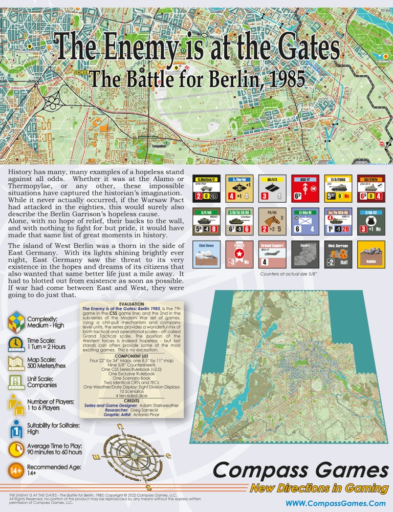 The Enemy is at the Gates est le deuxième volet de la série Modern War, qui utilise le célèbre Company Scale System. Les joueurs mèneront cette bataille en utilisant principalement des compagnies à l'échelle de 500 mètres par hexagone. Chaque tour dure 2 heures et le jeu utilise un système de "chit-pull" qui permet de jouer en face à face de manière imprévisible et de vivre une excellente expérience en solitaire. Les cartes sont minutieusement dessinées par Antonio Pinar, ce qui en fait peut-être la meilleure carte urbaine jamais réalisée. Greg Sarnecki est également de la partie pour fournir l'ordre de bataille le plus précis jamais réalisé pour cette campagne. Il s'agit du jeu ultime de guerre urbaine moderne à grande échelle. Comme il sied à un jeu sur la guerre moderne, la puissance aérienne, les hélicoptères, la guerre électronique, les armes chimiques et le sabotage seront également inclus. L'utilisation efficace de toutes vos armes déterminera le vainqueur de la bataille de Berlin !
