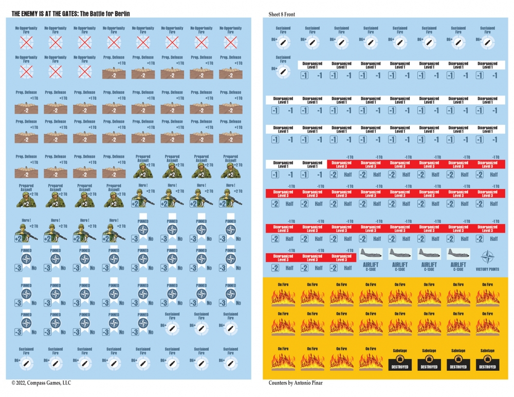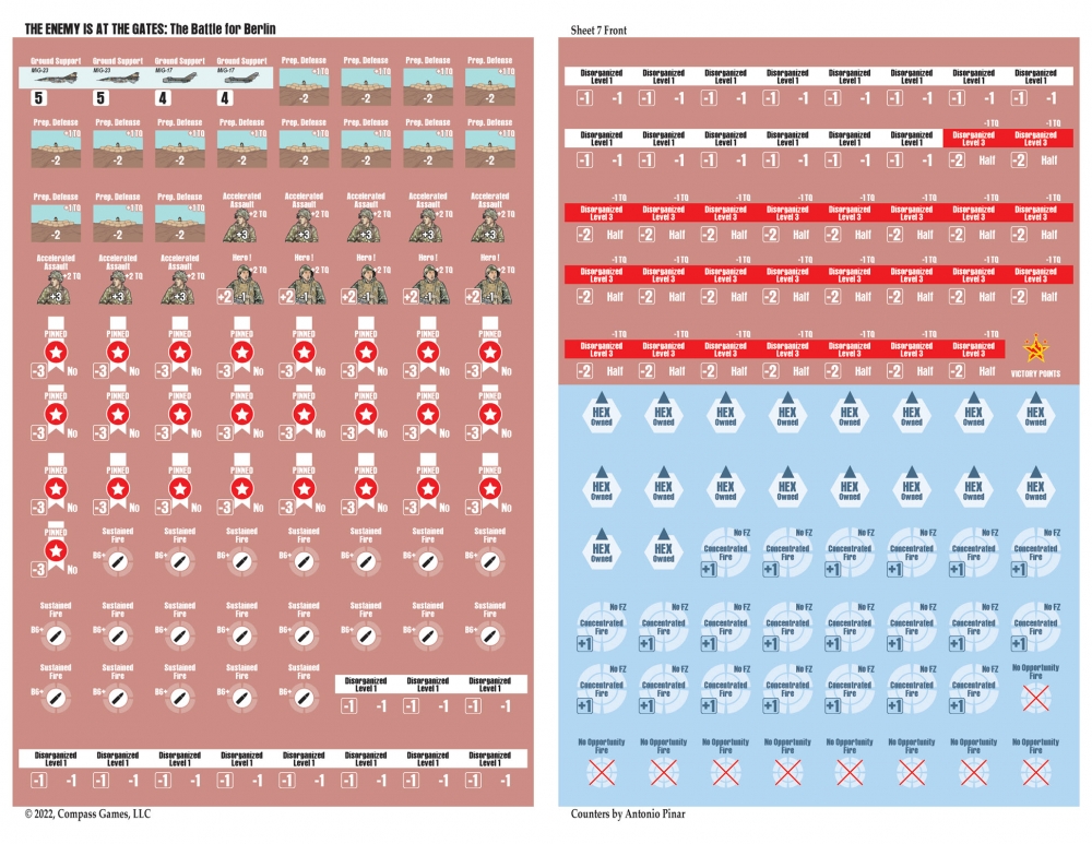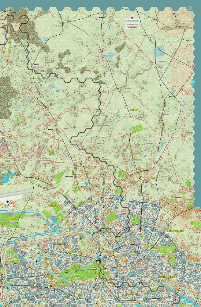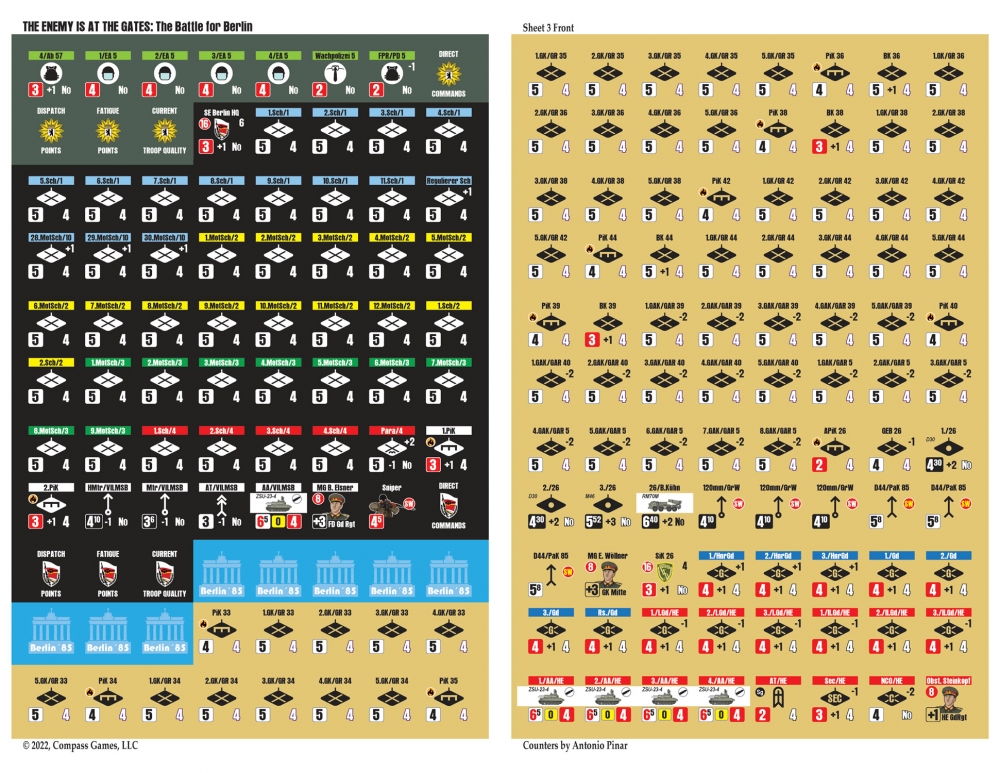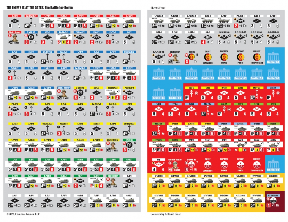 The Enemy is at the Gates est le deuxième volet de la série Modern War, qui utilise le célèbre Company Scale System. Les joueurs mèneront cette bataille en utilisant principalement des compagnies à l'échelle de 500 mètres par hexagone. Chaque tour dure 2 heures et le jeu utilise un système de "chit-pull" qui permet de jouer en face à face de manière imprévisible et de vivre une excellente expérience en solitaire. Les cartes sont minutieusement dessinées par Antonio Pinar, ce qui en fait peut-être la meilleure carte urbaine jamais réalisée. Greg Sarnecki est également de la partie pour fournir l'ordre de bataille le plus précis jamais réalisé pour cette campagne. Il s'agit du jeu ultime de guerre urbaine moderne à grande échelle. Comme il sied à un jeu sur la guerre moderne, la puissance aérienne, les hélicoptères, la guerre électronique, les armes chimiques et le sabotage seront également inclus. L'utilisation efficace de toutes vos armes déterminera le vainqueur de la bataille de Berlin !