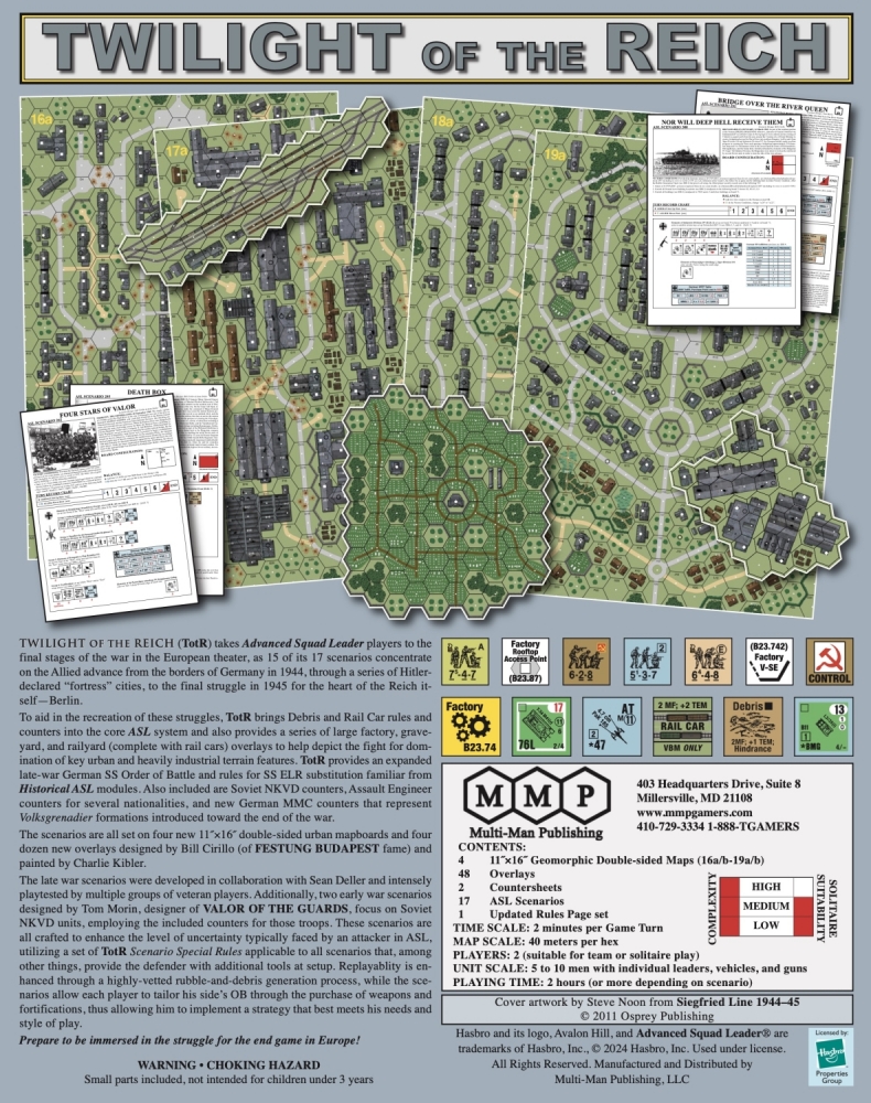 TWILIGHT OF THE REICH (TotR) takes Advanced Squad Leader players to the final stages of the war in the European theater, as 15 of its 17 scenarios concentrate on the Allied advance from the borders of Germany in 1944, through a series of Hitler-declared “fortress” cities, to the final struggle in 1945 for the heart of the Reich itself—Berlin.