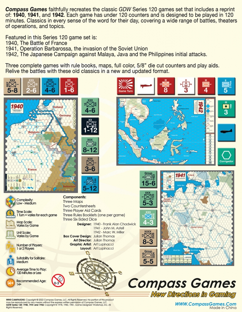 WII Campaigns : 1940, 1941 et 1942 est la recréation fidèle non pas d'un, mais de TROIS classiques de la série 120 de GDW, dans une même boîte. Chacun des trois jeux est conçu comme un stimulant jeu d'introduction aux wargames. Le "120" signifie que chaque jeu de cette série n'utilise pas plus de 120 pions, et tous sont conçus pour être joués en deux heures ou moins sans sacrifier la qualité historique ou l'excellence du jeu. Revivez les batailles avec ces classiques dans un format nouveau et mis à jour (pions et carte plus grands).
