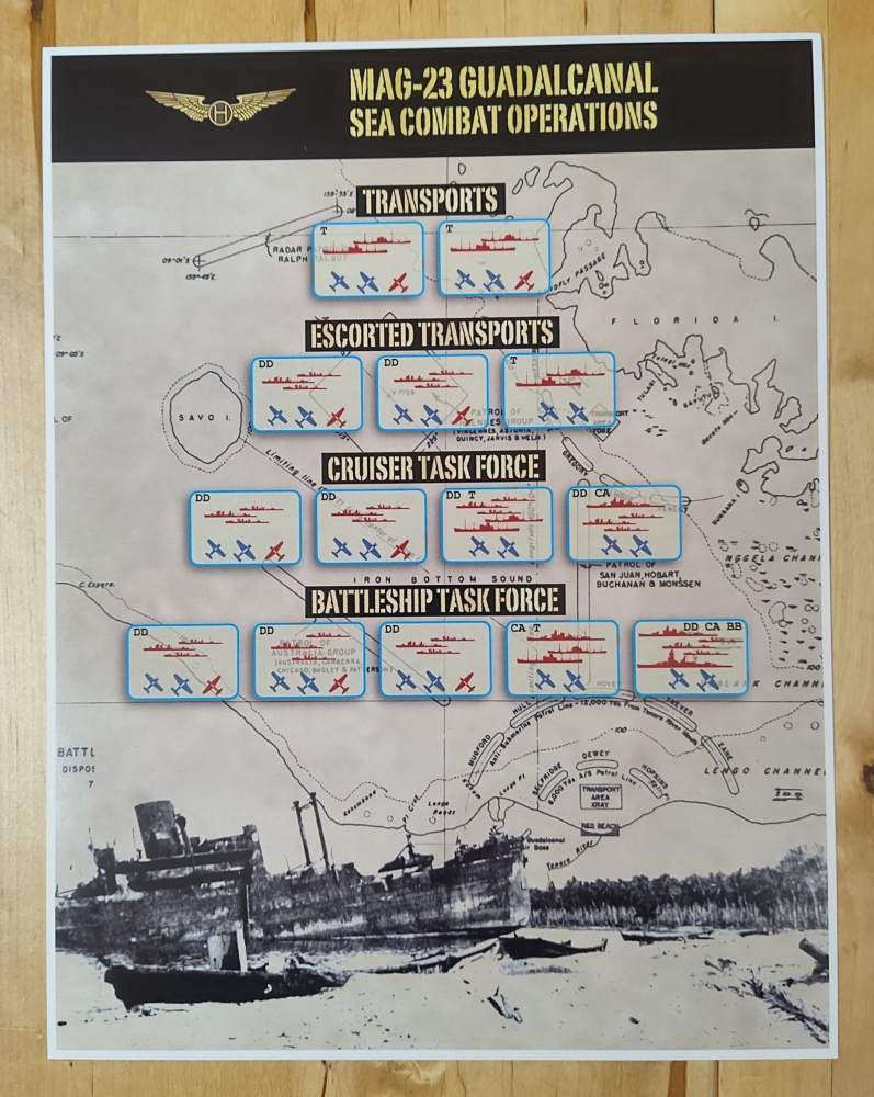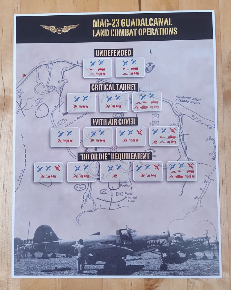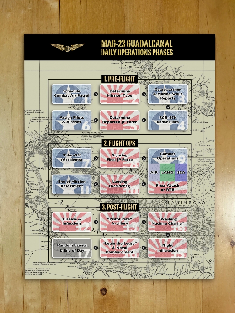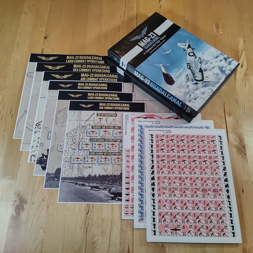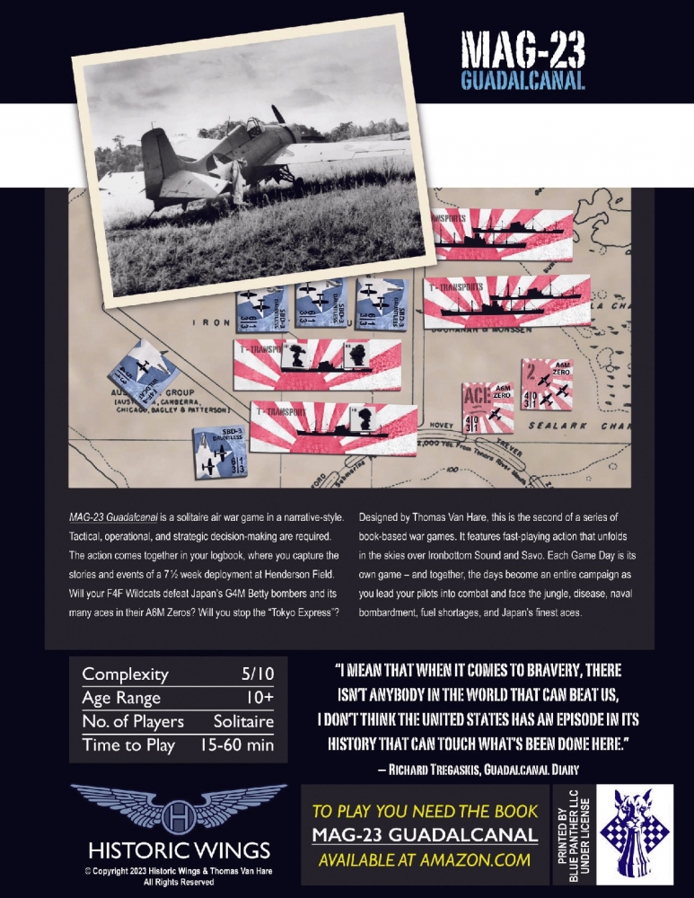Conçu par Thomas Van Hare, MAG-23 est le deuxième jeu d'une série de wargames publiés par Historic Wings. Il propose une action rapide qui se déroule dans le ciel d'Ironbottom Sound et de Savo. Chaque jour de jeu est un jeu en lui-même - et ensemble, les jours deviennent une campagne entière alors que vous menez vos pilotes au combat et affrontez la jungle, la maladie, les bombardements navals, les pénuries de carburant, et les meilleurs as du Japon.
