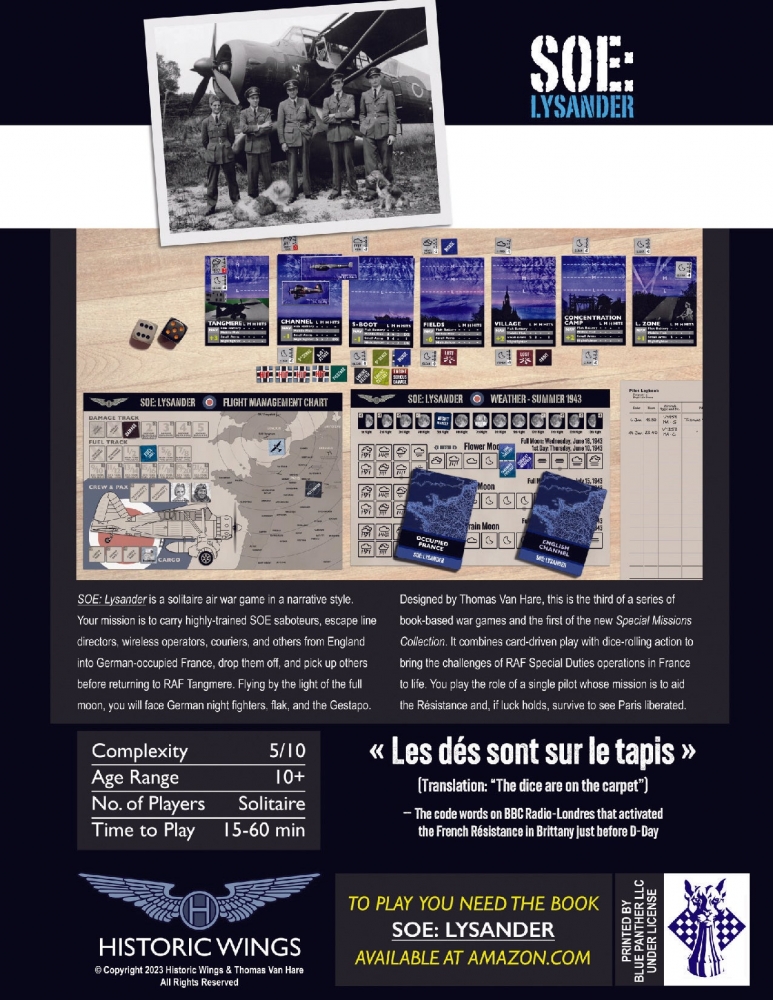 Conçu par Thomas Van Hare, ce jeu est le troisième d'une série de jeux de guerre basés sur des livres, et le premier de la nouvelle collection "Missions spéciales". Il combine un jeu de cartes et un set de dés pour donner vie aux défis des opérations des services spéciaux de la RAF en France. Vous jouez le rôle d'un pilote dont la mission est d'aider la Résistance française et, si la chance lui sourit, de survivre jusqu'à la libération de Paris.