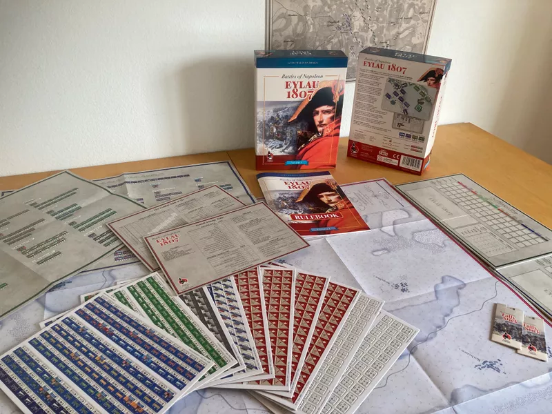 EYLAU 1807 contient 1120 grands pions (15 mm), 280 pions alternatifs, 2 grandes cartes (chacune 86 x 55 cm) avec de grands hexagones, 4 cartes et tableaux, 125 cubes en bois, 2 plateaux de pions, 1 manuel de règles et 4 dés personnalisés.
