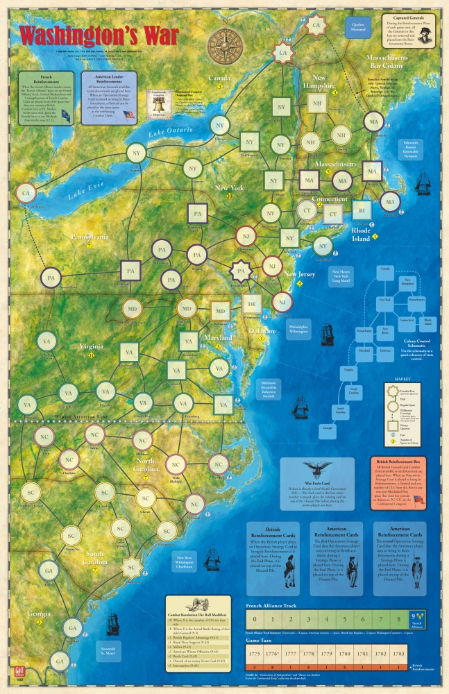 Washington’s War propose un système de combat à base de dés qui résout rapidement les combats et qui est très adapté au jeu sur Internet. Le jeu propose également un nouveau mécanisme de défausse qui rend toutes les cartes de votre main jouables en permettant à votre adversaire d'acheter ses événements défaussés contre une carte d'opération. Désormais, les distributions de cartes inhabituelles créent des défis et non des obstacles insurmontables pour faire avancer votre stratégie.