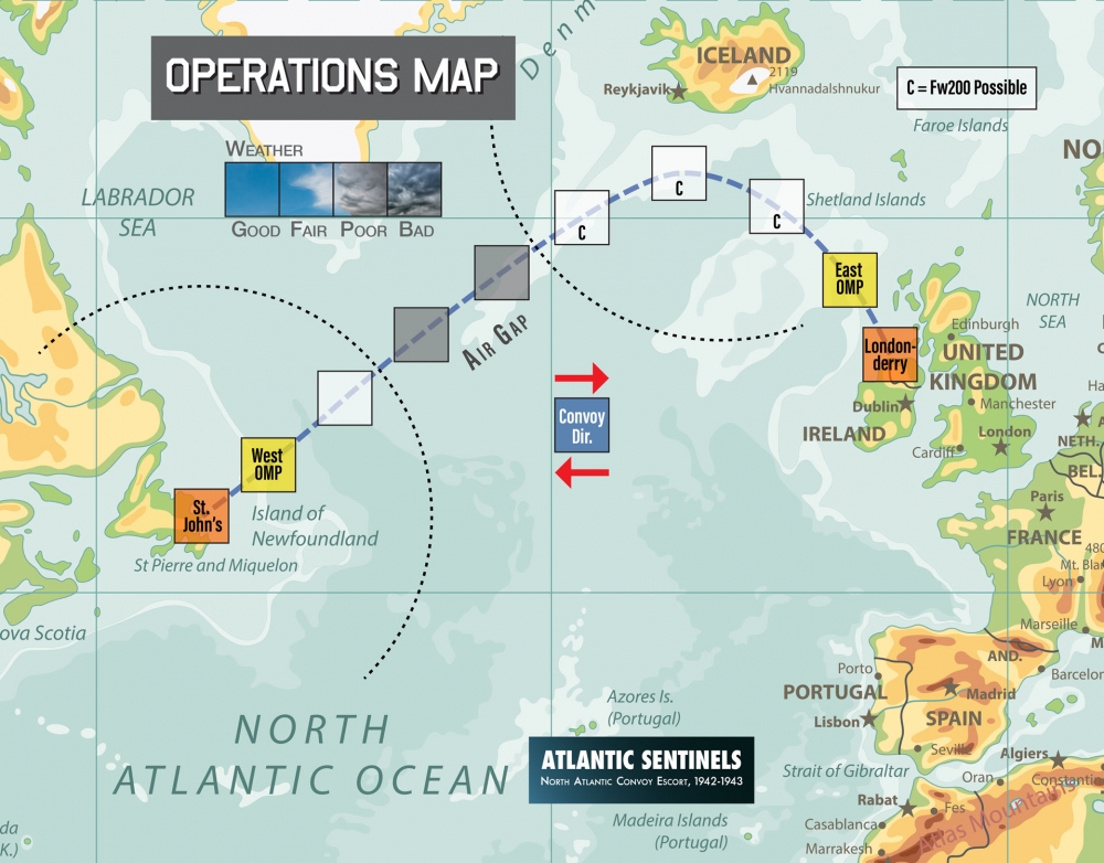 Au fil du jeu, le groupe d'escorte peut recevoir des améliorations sous la forme de radars supplémentaires, d'équipements HF/DF (radiogoniométrie à haute fréquence) et éventuellement de navires supplémentaires. Le soutien aérien peut être essentiel mais, jusqu'à l'arrivée des CVE "jeep carriers", la "fosse noire" au centre de l'Atlantique reste une zone très dangereuse.