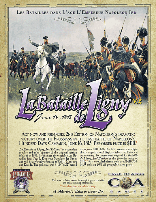 La Bataille de Ligny, 2nd Edition is a complete graphic and rule upgrade of the original version in 1991. It continues the venerable Les Batailles dans L'age L'Empereur Napoleon 1er Series and will be as visually stunning as QB II, Moscowa and Dresde.
