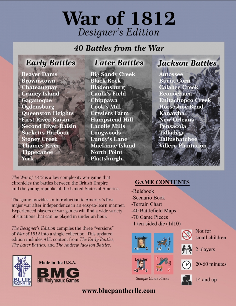 The War of 1812 est un jeu de guerre de faible complexité qui recrée 40 batailles entre l'Empire britannique et la jeune république des États-Unis d'Amérique. Pour un ou deux joueurs.