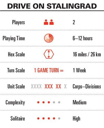 Drive on Stalingrad Deluxe Edition est une simulation stratégique pour deux joueurs, de complexité moyenne, de deux offensives : l'opération Blau, la tentative allemande de s'emparer de Stalingrad et de la région du Caucase de l'Union soviétique au cours de l'été 1942, et l'opération Uranus, la contre-offensive soviétique à la fin de l'année 1942.