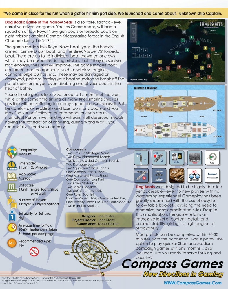 Dog Boats : Battle of the Narrow Seas est un wargame solitaire, tactique et narratif. En tant que commandant, vous dirigez une escadre de 4 canonnières ou torpilleurs de la Royal Navy lors de missions nocturnes contre les forces allemandes de la Kriegsmarine dans la Manche en 1943-1944.