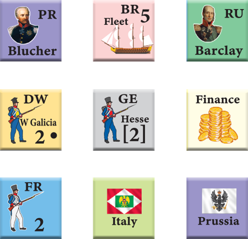 Carte de 56x86 cm, 228 pions de 15cm.